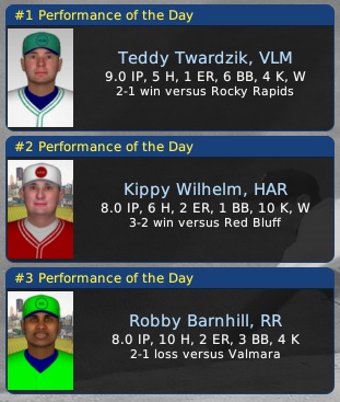 In the first frame, Valmara put together four singles by 2B Ken Jensen (.375), CF Don Ritchie (.357), 1B Cain Greene (.310) and 3B Jose Vargas (.462) to get all the runs they needed...RF Jason Wagsdale and Vargas got the RBIs... two walks led to Rocky Rapids only score in the second inning... Greene had three hits to lead the Vipers at the plate with help from Vargas and Jensen, each with a pair of hits... Snapper 1B Masaharu Kawasaki (.217) smacked three hits for the losers.