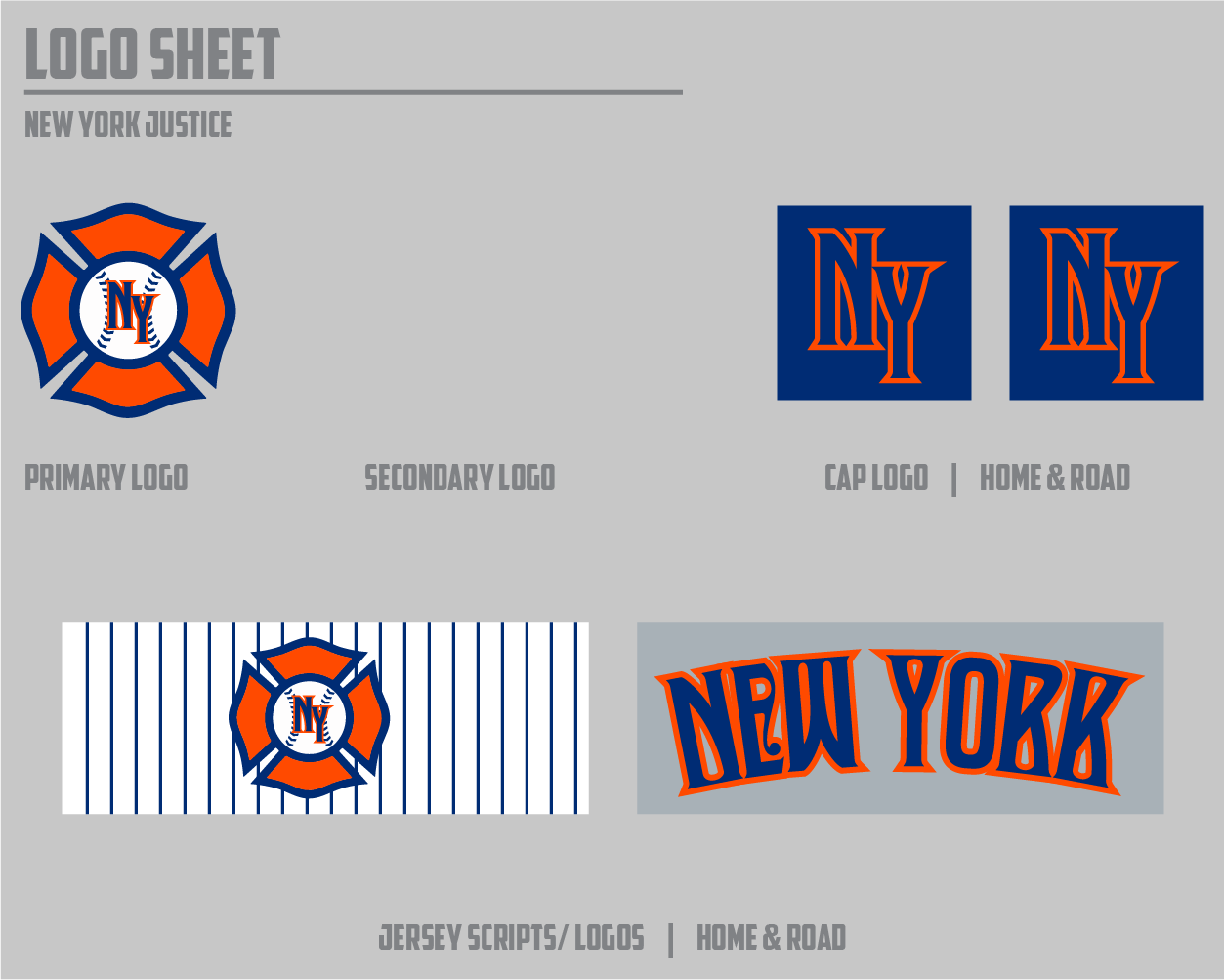 The New York Justice are proud to pay homage to the men and women of New York in their logo by adopting a fire shield logo with a classic baseball design in the middle to tie into America's pastime. This logo is featured on the chest of their home jerseys that don pinstripes. You will see a classic New York script across the chest of the road jersey set. Neither jersey features any shoulder patches. Both the home and away jersey feature a simplistic cap design with "NY" to represent the city. The Justice have bounced back and forth between several color pallets before finally deciding on New York Mets (MLB) blue and orange. After forming a combination of the Yankees and Mets the New York Justice feel they have formed the perfect iconic image for not only a large market franchise but the first team to join the "ABA". Without further adue - New York Justice: