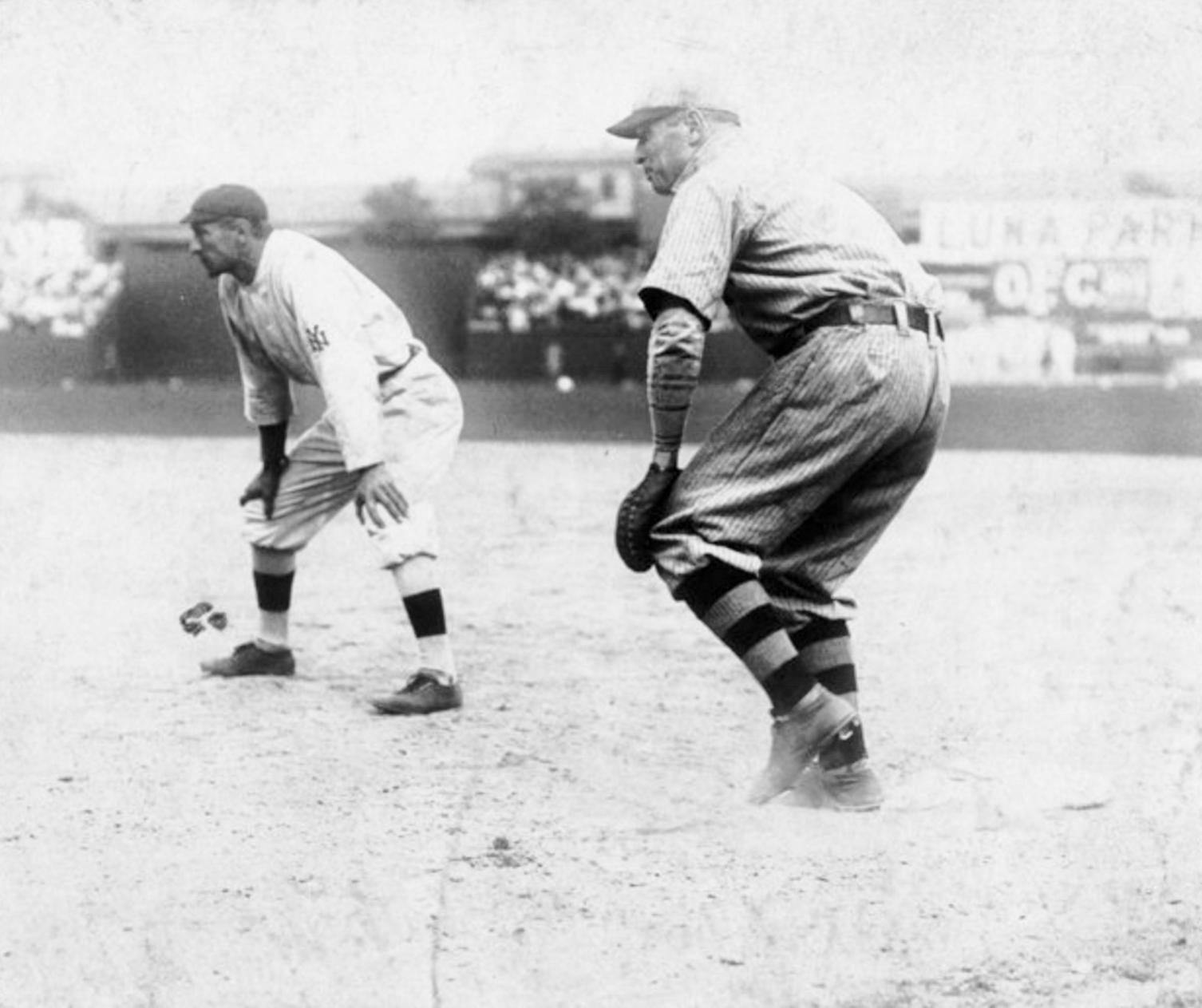 So if it's 1908 and we're in New York and that's Fred with Frank Chance, Cheremeteff determined that there were only two times all year Merkle would have been reached first - and both were during the world-changing game of September 23. The first was when he walked in the 3rd to give the Giants runners on first and second - and to give Chance no reason to hold him on the bag. The second was when Merkle's two-out single sent Harry McCormick to third base with the potential winning run in the bottom of the ninth of the 1-1 tie.