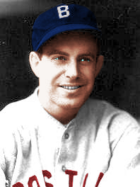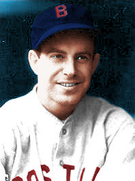 Rick Ferrell colorized by request with the Boston Red Sox. Image is presented with original white B with red B and red uniform letters. . with colorized blue background and background removed and replaced with solid background.