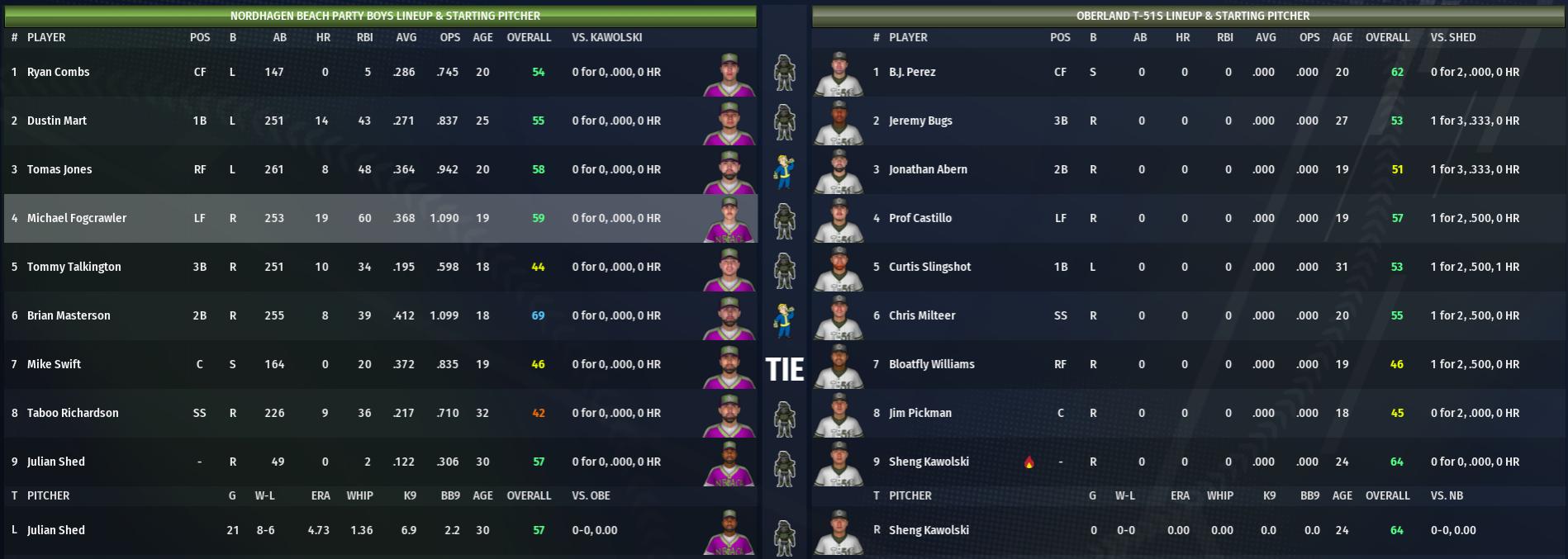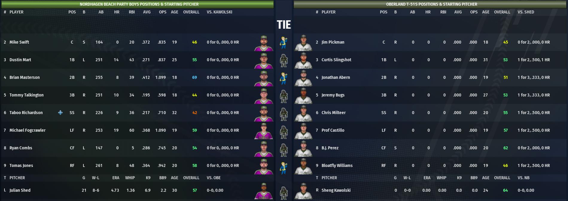 For Oberland, there is really only one players to talk about in the playoffs: ace Sheng Kawolski. In four games, he has dominated the playoffs, holding teams to 1, 2, 1, and 0 runs. He has been so good, that the T-51s offensive woes in the playoffs when he has pitched has been overshadowed. Gerald Jerry has not been as good, but he did win 11 games in the regular season, followed by Matt Udder (who will probably pitch only Game 5 if necessary) who won 12.