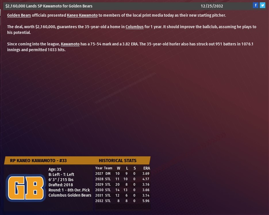 The Columbus Golden Bears have announced the signing of former St. Louis River Walkers starting pitcher Kaneo Kawamoto to a one-year contract worth $2,160,000.