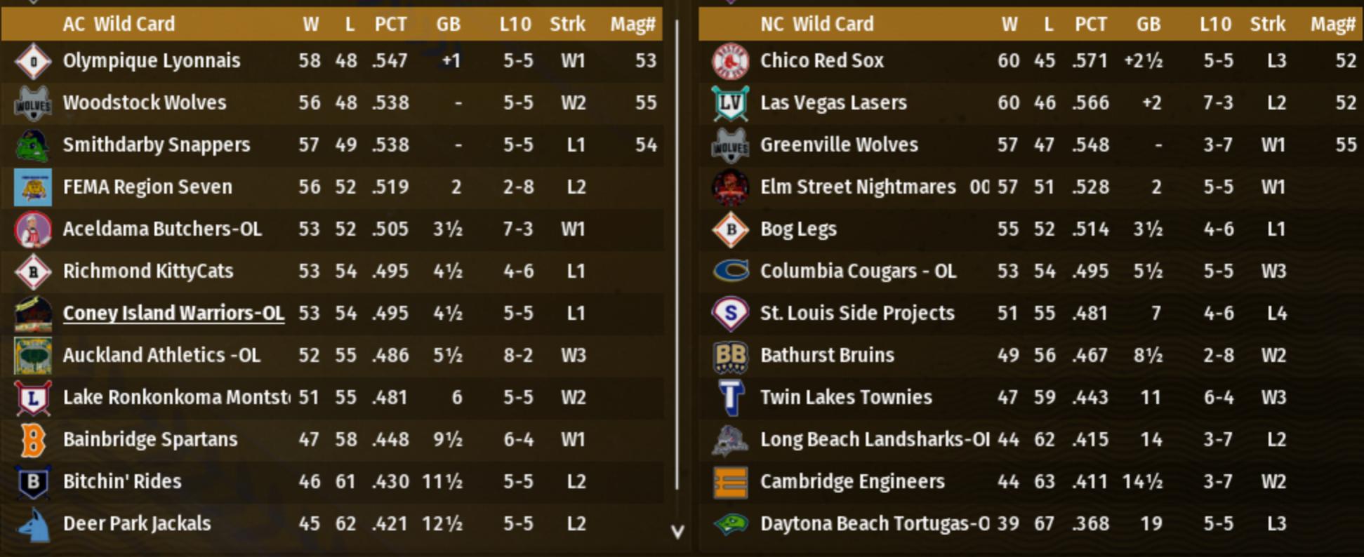 In PT play so far Shinbone is the only team in a playoff position, leading the AC East with a 61-47 record. The rest are hovering around .500 except Long Beach and Daytona Beach who are both facing relegation.