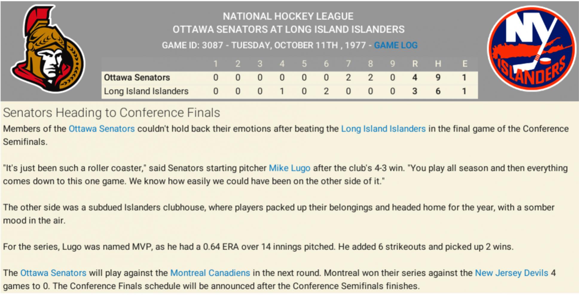 It looked like the Islanders would become the second team this year to come back from a 3-1 series deficit, as they led 3-0 after 6 innings. But the Senators rallied for four runs in the 7th and 8th innings to survive and advance, and set up an all-Canadian Eastern Conference Final versus the Montreal Canadiens.