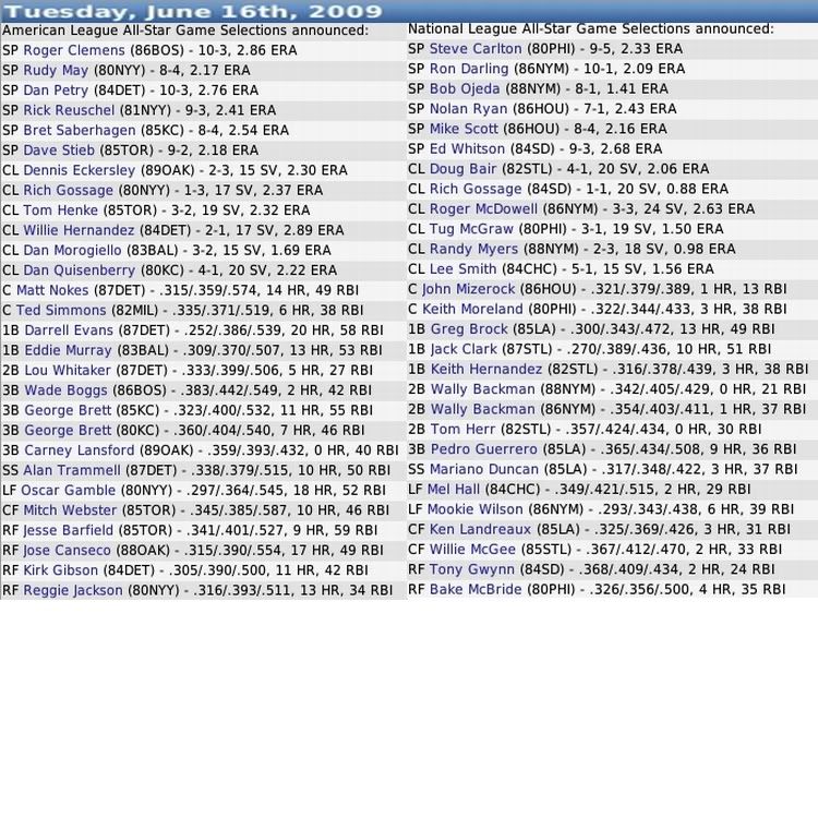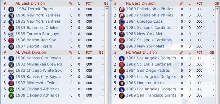 I took all of the World Series participants from 1980-1989 and put them in their respective leagues. I then took the next four best records of teams that lost in the LCS from each league and put them in their respective leagues as well. The result was a league that looks like this: ![]() The league is set with all transactions, injuries and financials off. The league strategy, AI and modifiers are set to 1985. The designated hitter will be in effect in the AL. The league schedule will be 156 games with a balanced schedule and average series length of 3 games. Interleague play is off. That should mean each team will play each of the other 13 teams in their league 12 times (6 at home, 6 on the road). The playoffs will include each divison winner and two wild cards. The first round is the Divisional Series and will be a best-of-five. The second round will be the League Championship Series and the final round will be the World Series. The LCS and World Series will be best-of-seven. Awards will be given for MVP, Cy Young, and Gold Glove. Make your predictions now and follow along. There will be a prize for the most accurate predictions (Haven't determind the prize yeat but it will be nice) Accuracy totals will be based off of standing predictions, playoffs and award winners. To be unbiased, there will be a points based scoring system. The points are as follows: Correct place in standing: 5 pts Correct season record: 5 pts Correct divison winner: 5 pts Correct wild card team: 5 pts Correct Divisonal Series winner: 7.5 pts Correct LCS winner: 10 pts Correct World Series winner: 20 points Perfect divisional standing: 25 extra points for each division correct All four divisional standings correct: 100 extra points Perfect playoff prediction: 50 extra points All four divisions and entire playoffs correct: 250 extra points Correct Cy Young winner: 25 points Correct MVP winner: 25 points Correct Gold Glove winner: 15 points each correct Correct Cy Young and MVP: 75 extra points All Gold Glove winners correct: 200 extra points Correct batting title winner: 10 pts for each correct (AL and NL) Correct HR champ: 10 pts each correct (AL and NL) Correct RBI champ: 10 pts each correct (AL and NL) Correct SB champ: 10 pts each correct (AL and NL) Correct pitching wins leader: 10 pts each correct (AL and NL) Correct ERA champ: 10 pts each correct (AL and NL) Correct saves champ: 10 pts each correct (AL and NL) Correctly picking champs exact stat (ex. .351 avg, 25 wins, 2.29 ERA, etc): 10 extra points each correct Start making your predictions. You must select the year of the team and player in your predictions (Ex. 1981 Fernando Valenzuela, 1982 St. Louis Cardinals, etc.) All predictions must be made before I post my first update (probably 2-3 days). Enjoy!