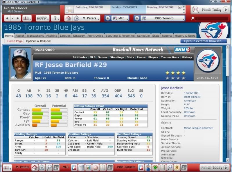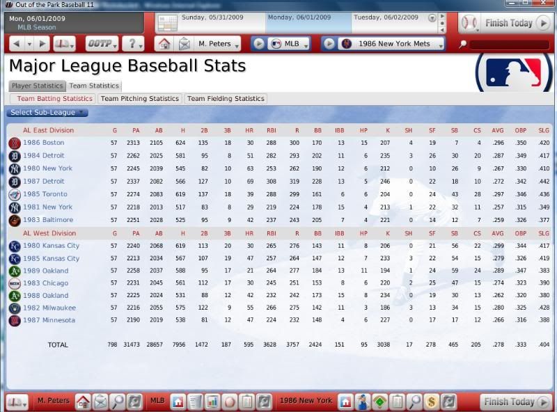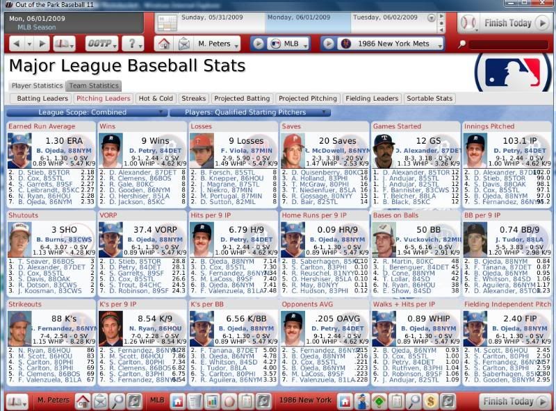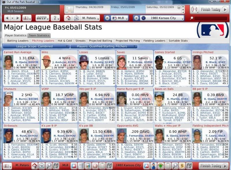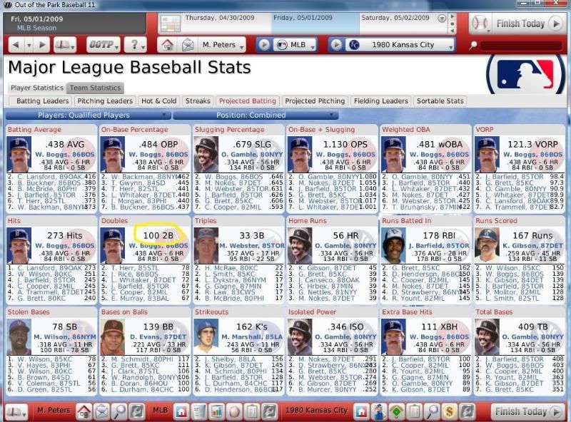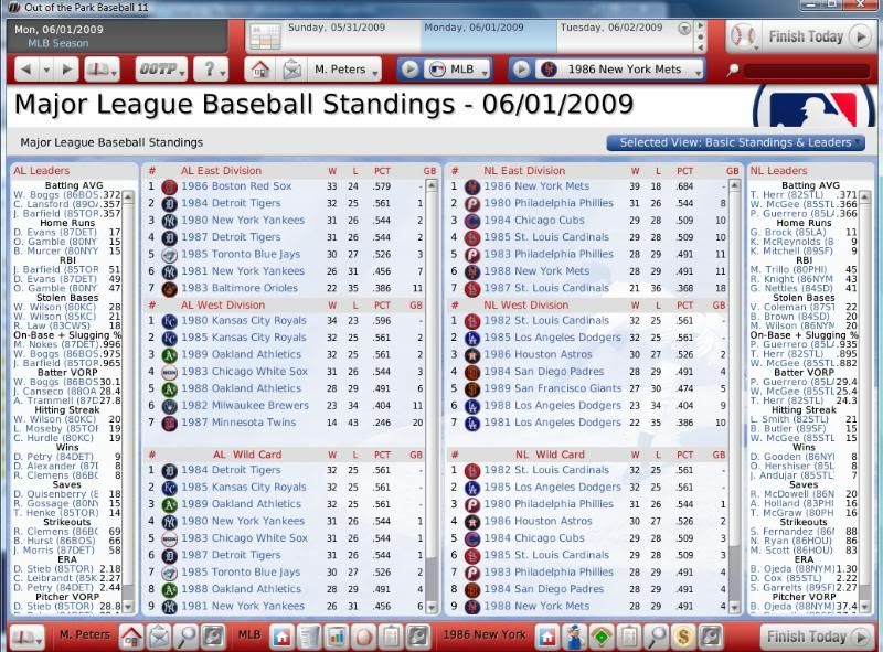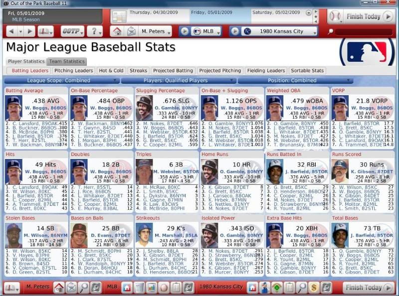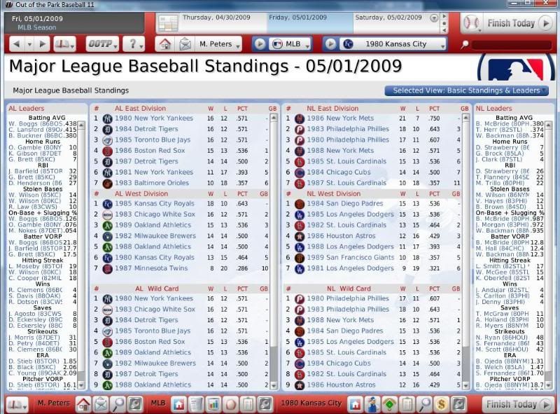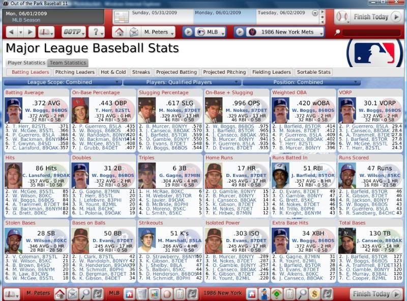 The '88 Mets definitely look like the team to beat and the NL West dosen't look like they belong in the league. Here is a look at the May 1 standings: ![]() '86 Wade Boggs is off to an amazing start. His .438 avg paces the league. '80 Oscar Gamble is turning heads with his league leading 10 HR, quite a start considering he hit 14 in 1980 in RL. Here is a look at the batting leaders: ![]() Nothing super surprising in the pitching department except '80 Tug McGraw over half-way to his RL total save total in one month. Here's a look at the pitching leaders: ![]() Taking a look at the batting projections, one thing really stands out. Take a look at '86 Wade's projected doubles!!! ![]() Off to sim some more. Next update coming either half-way through May or at the end of May...
