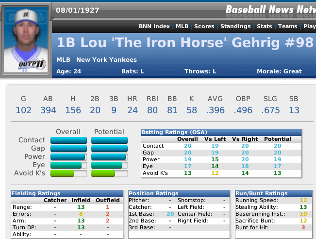 As requested by RchW, here's Harry, Lou Gehrig, Paul Waner, and Rogers Hornsby. The first three are having very good years and have similar ratings for Contact and Gap. Hornsby is having a terrible year, hitting .276 when he hit .361 in reality. The only thing of note is that his Gap rating is slighty lower than that of those other three guys.
