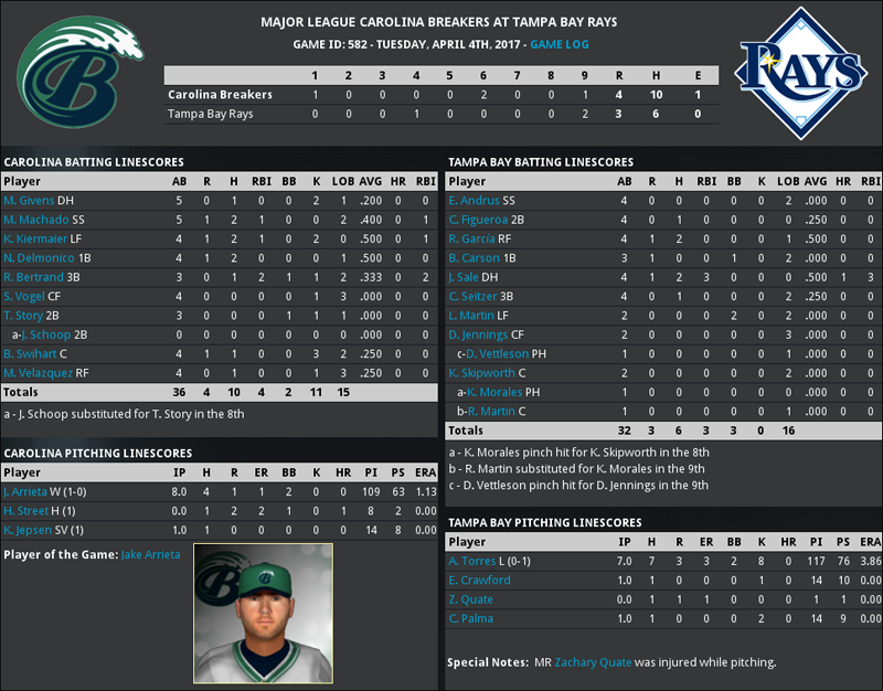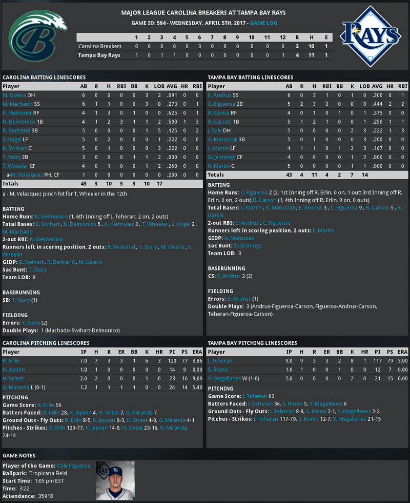 Time to see what former Cy Young winner Julio Teheran can do. I have decided to play Russell Martin against left-handed pitchers, after he was a pleasant surprise in Spring Training, batting .305. Who knows? If he can turn his game around, he could win back the starting spot. ![]() Quite the second game of the season, if I do say so myself. I was very impressed by Teheran's 9-inning effort, even though he does not get the win to show for it; a single mistake pitch to the ever-dangerous Nick Delmonico cost him. He also got some serious help from his defense, as they turned three double plays over the course of those 9 innings. Meanwhile, Russell Martin and Addison Maruszak both fell flat in their debuts. I am very disappointed in Maruszak, who came to bat with the bases loaded and no outs in the bottom of the 6th, and promptly grounded into a 6-1-3 double play. And Cole Figueroa put on a show early in the game, that was great to see. So far, the top of the lineup has done fine; the bottom has some catching-up to do. NOTE: I'm trying to decide which style of box score I want to be posting. This one requires far less cutting-and-pasting to put together than the one above, but I fear it's a bit too big. I'll be experimenting with this over the course of these first few games. Last edited by Fyrestorm3; 01-23-2013 at 03:18 AM. |