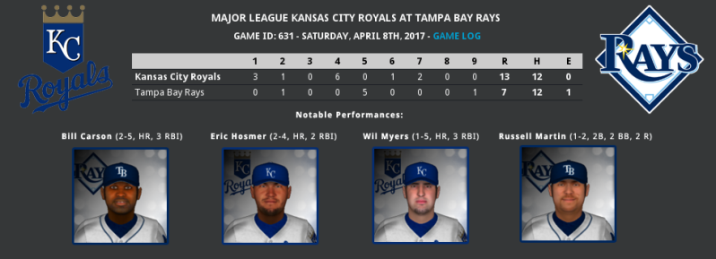 Got the news yesterday that Zachary Quate has a partially torn labrum. He's going to miss up to 3 months. What a lovely way to start the season. Well, time to see what Carlos Perez can do in the big leagues! Today, we begin a series with the Kansas City Royals. It's still hard for me to view the Royals as actual contenders, but they have come a long way in recent years. They still have trouble competing against the AL's elite, but they've actually been finishing with winning records, and even made the playoffs in 2014, led by Jose Flores and his career .320 batting average. Before the season, they also picked up Jordan Walden, the former shut-down closer of the Angels. We're going to want to be ahead BEFORE the 9th inning if we hope to get some W's. ![]() Well, Price started out really good, notching a bunch of K's. But he also plunked 3 batters, which likely didn't help him much, and I wound up pulling him from the game much too late to make a difference. The good news is, being down 6-0 in the 8th gave me an excuse to put Carlos Perez into the game. He did pretty darn good for his first Major League experience: his control was a little shaky (likely nerves), but he didn't allow a hit in a full two innings. The offense came alive late in the game, including a home run by Seitzer... would have been nice to see that earlier, though. We also got our first taste of Jordan Walden, who got all three outs in the 9th on just 7 pitches. Meanwhile, Desmond Jennings has yet to get a hit this year. I'm contemplating starting Drew Vettleson soon, but we'll give it another game or two. Leonys Martin has been playing such good defense in Left Field that I'm hesitant to move him out of that position. |