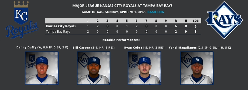 We'd better win tonight. I don't want to be swept by the Royals. To try and stop our skid, we hand the ball to... Dallas Beeler? Oh dear. The good news is, we're facing Danny Duffy, who has been remarkably inconsistent over the past few years. He got the win in his first start of the season, but allowed 12 hits over 6 innings. Hopefully we can string a few together ourselves. ![]() Oh dear lord, something's going to have to change here. Beeler held us in the game for a few innings, but the offense just couldn't get anything done. On the other side of the ball, Duffy was spectacular. The only reason we scored two in the first was because Eric Hosmer botched a pop foul, allowing Bill Carson an extra pitch, which he promptly bashed out of the park. Were it not for that error, we'd have been shut out. We're now 1-4 in our first 5 games. This has to change. Now. |