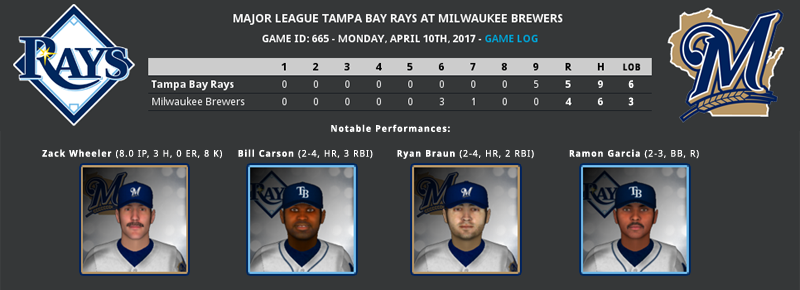 The first weekly power rankings are out, and yep, we're ranked 29th out of 30. The only team worse is the Mariners, also 1-4 on the season. We travel to Milwaukee today to face the 4-3 Brewers and recent Player of the Week winner Bill Bates. The good news is, it's our top 3 pitchers against their bottom 3, and their team ERA ranks 12th in the NL. The bad news is, we're the Away team, which means no DH. Although, Alex Torres has actually hit a home run each of the past two years - maybe he can do it again tonight. ----- ![]() ----- Ho boy, it took quite a while, but we finally strung some hits together tonight! It was one heck of a pitchers' duel through 5 innings, as both Torres and Zack Wheeler had each only allowed 1 hit. That changed quickly in the bottom of the 6th, with a Ryan Braun home run, and all I could picture from that point forward was another game in the Loss column. But somehow, miraculously, the team pulled together and staged a spectacular ninth-inning comeback, starting with a 3-run bomb by Bill Carson. It was Josh Sale who then tied the game with a double, and Elvis Andrus who came through to put us ahead. Sergio Romo then shut the door, no problem, and we got ourselves our second W of the season. Finally. |