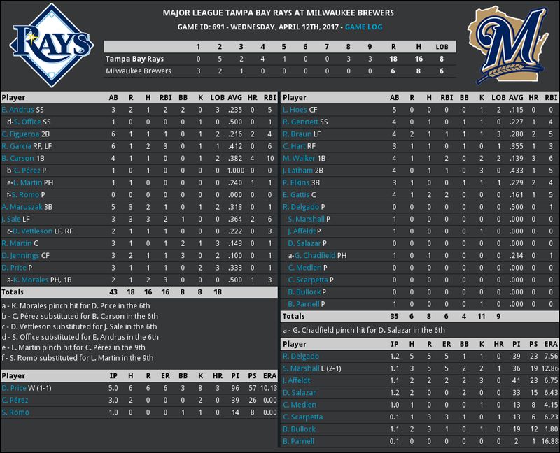 So far, it's looking like that 5-run 9th has really lit a fire under the players. Let's hope they can keep it going tonight - a sweep would go a long way towards regaining the fans' confidence in both me and the team. ----- ![]() ----- Price was shaky as hell today, but he got the Win anyway, as our offense absolutely steamrolled the Brewers. Everyone got in on the action - Jennings got a hit, Price drove in a run, Morales hit a home run, Sale was nigh unstoppable. Milwaukee actually went through 8 different pitchers, and only Danny Salazar seemed to be able to temporarily hold down this lineup. I don't know if this series says more about us or Milwaukee, but either way, I'll take the sweep and I'll take us being .500 on the season. |