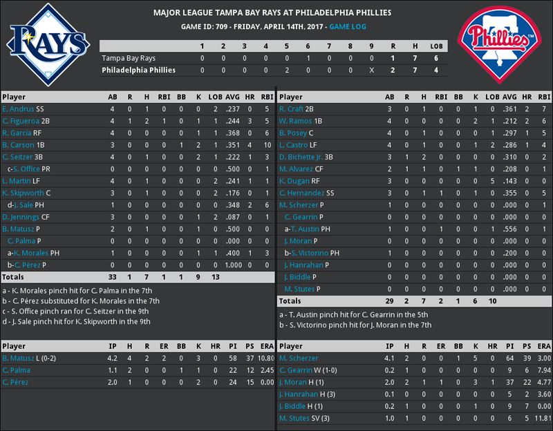 We arrived in Philadelphia after having a day off for travel. The Phillies are 4-4 on the year, although they were just swept by Seattle (yes, both Seattle and us managed a sweep after going 1-4). Working in our favor is Gio Gonzalez - or rather the Phillies' lack thereof. It came out yesterday that he'll be undergoing Tommy John surgery and will be out for the year. But we'll still have to be very wary of Buster Posey and the rest of the Phillies' lineup, especially since they're righty-heavy, and our rotation is 3/5 southpaws. ![]() Well, it wasn't a good game, but it wasn't bad, either. No one performed particularly badly, but we just couldn't get it done. The only thing I'm concerned about is, again, Desmond Jennings. We were down by 1 in the 7th, with a runner on third and 1 out. All we needed was a sacrifice fly. We got a strikeout. Not good, not good at all. |