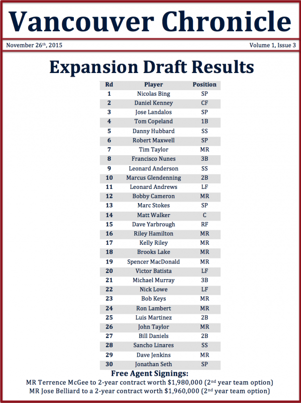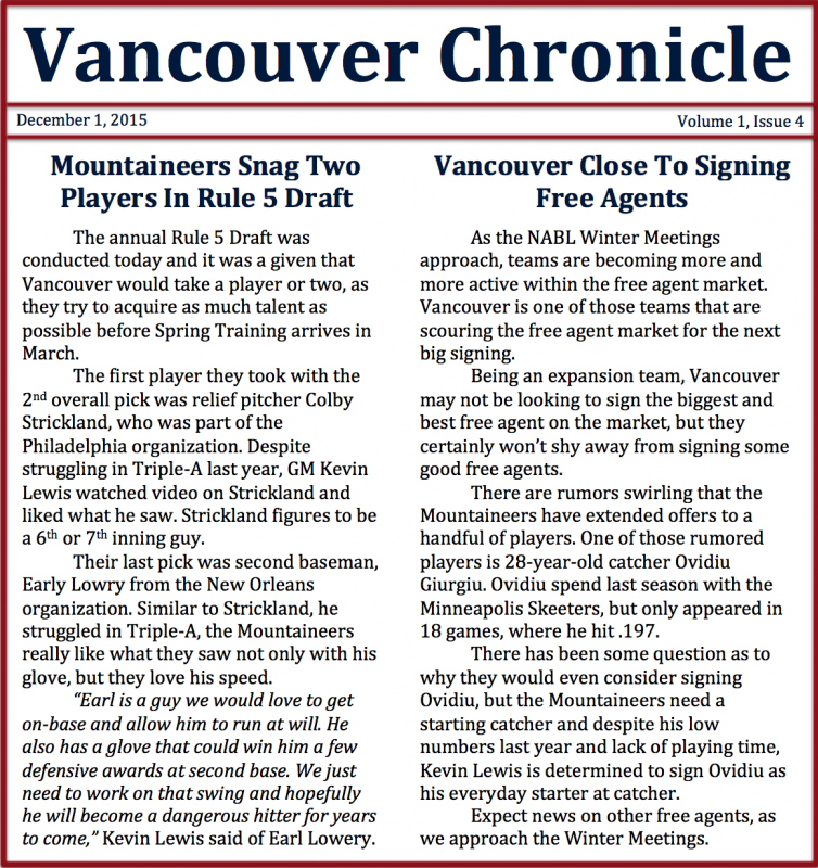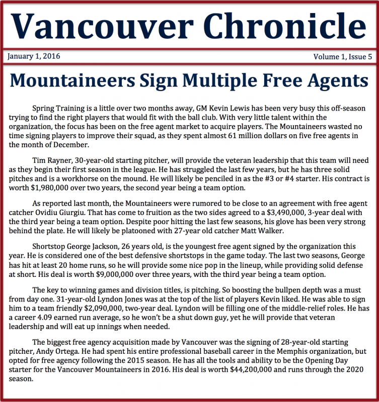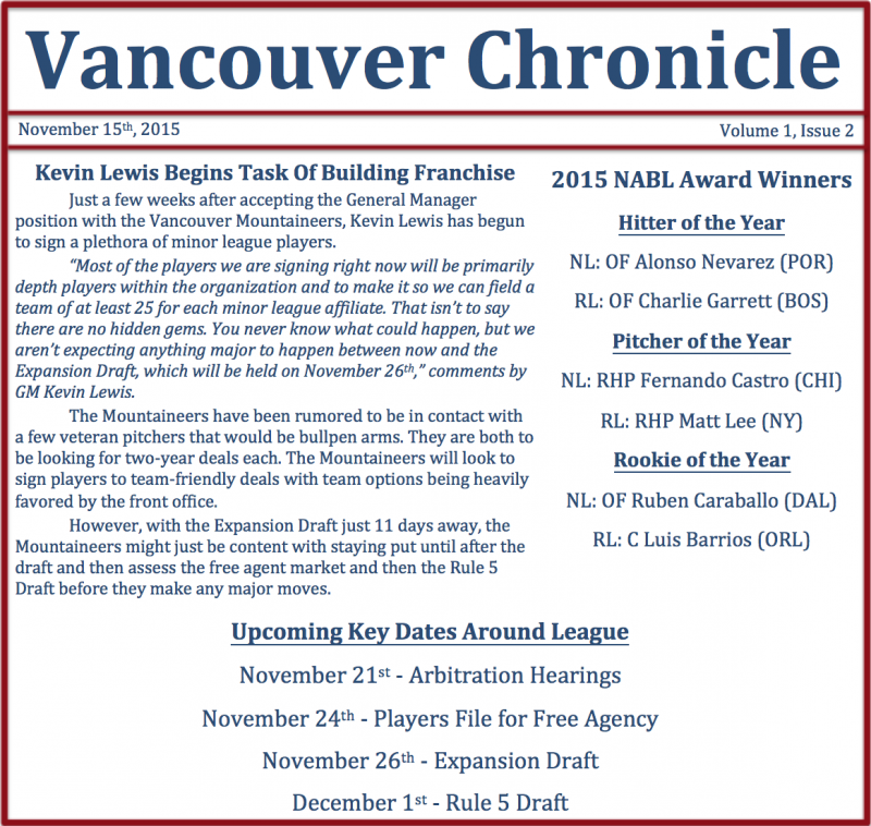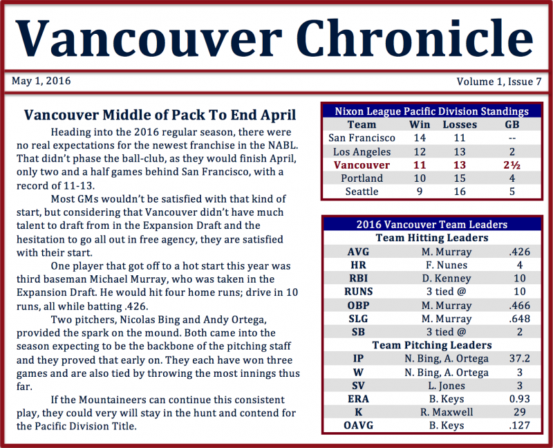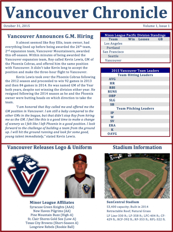 VANCOUVER, CAN (AP)-- The inevitable has finally happened within the United States Baseball League, a team has been placed in Canada. It was announced today that along with Albuquerque, New Mexico being awarded an expansion franchise, Vancouver was awarded the second expansion team. This marks the first time in the 36 years that a team will not be located within the United States. Thus, the league has changed the name from United States Baseball League (USBL) to North American Baseball League (NABL) effective immediately. It had been known for many years that Vancouver native and businessman, Roy Ellis was lobbying for a team in Vancouver, but commissioner Thomas Pierson was very adamant against expanding the league outside of the US. However, over the last several years, there was a lot of pressure from the owners to explore the possibility of expanding into Canada. After many discussions and a few votes, the league made it official today by announcing that Vancouver would become the 26th team in the NABL. Owner Roy Ellis wasted no time announcing the team name and releasing their logo and uniforms. The Vancouver Mountaineers will be based in the Pacific Division and will play their home games at SunCentral Stadium, which has a capacity of 53,400 and had a retractable roof. Look for more information about the Vancouver franchise and the announcement of their General Manager hiring, which is still in the process of wrapping up. Meanwhile, here is a look at how the NABL will be aligned.. ![]() |
