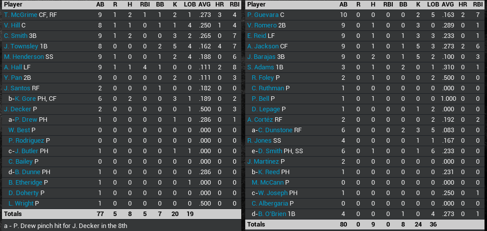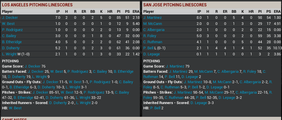 Here is the pitching lines as well as the batters for the game. The LA Stars are my team, though it was a simmed game, sadly!