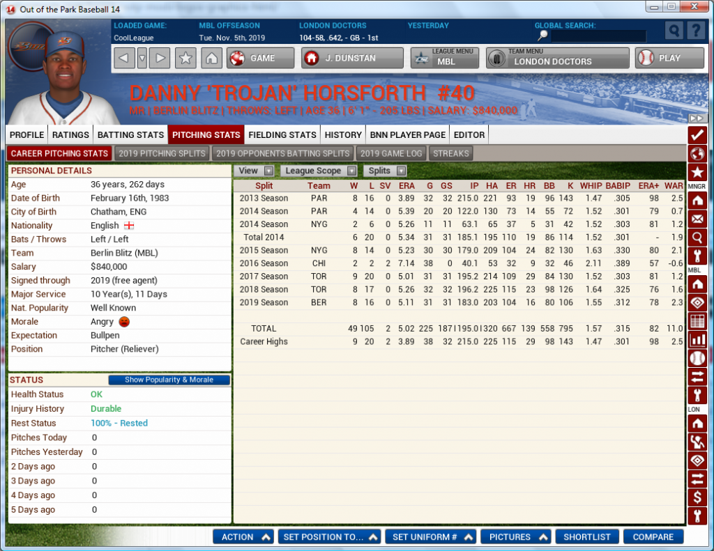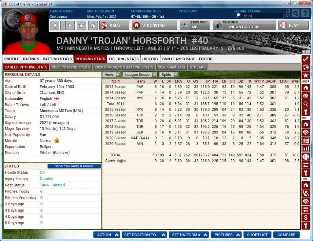 Horsforth still has yet to have anything resembling a good year, although in fairness the best team he ever pitched for was the 2015 New York Ghostbusters, who finished with a .500 record. I'm almost tempted to trade him to a good team - my own London Doctors, New York, Minnesota - to see if he's even capable of decent pitching.