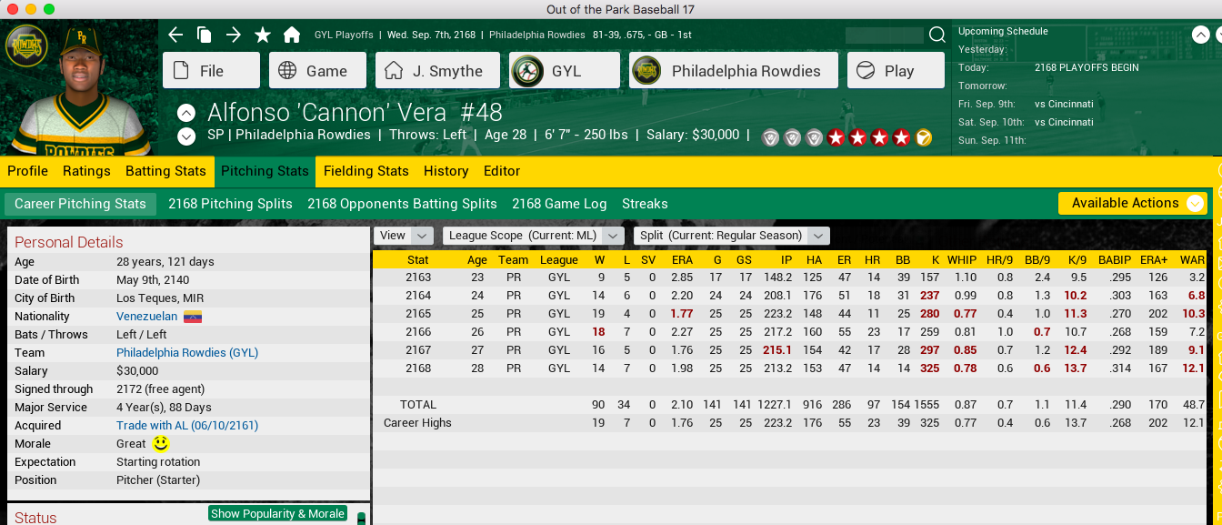 My ace, Alfonso Vera, is an absolute beast this year. Check out his K/BB ratio.