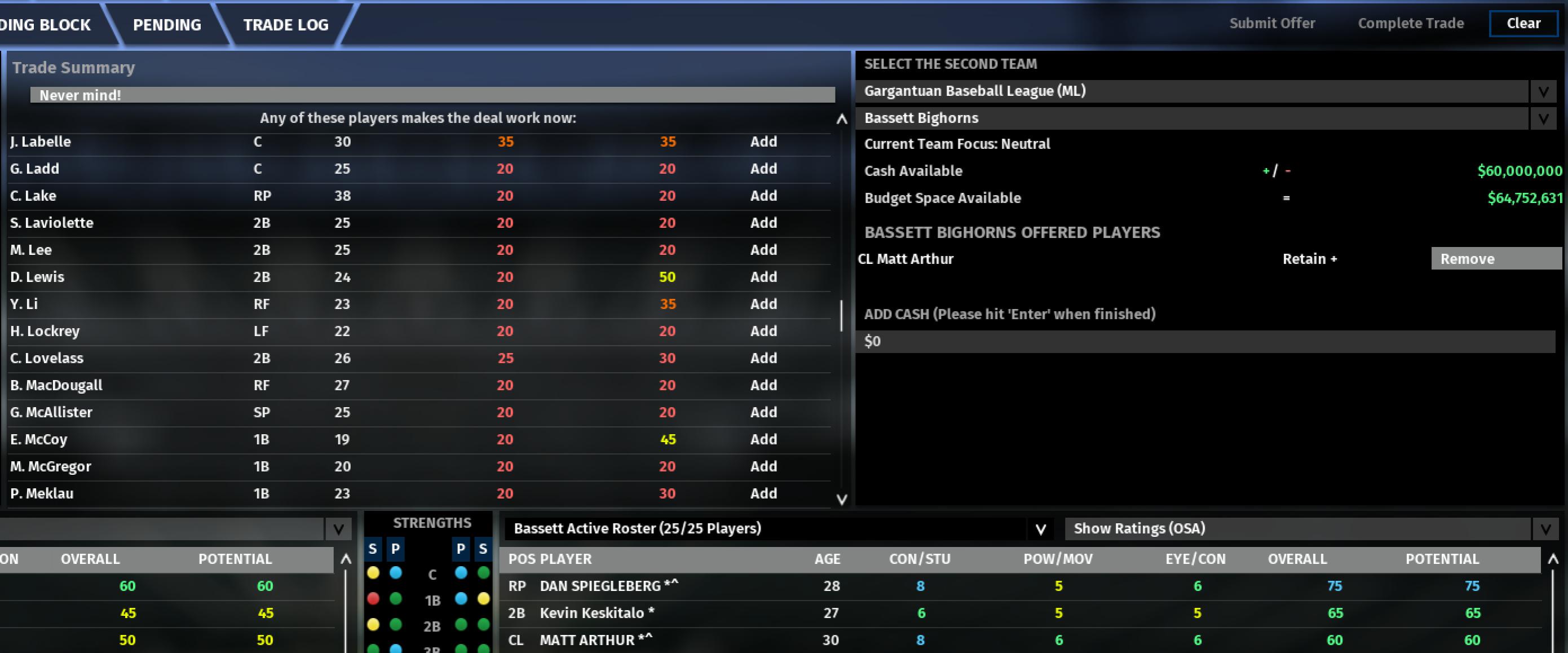 Note on my league, started in year 2000 with free agency required after 8 years of service. I am in middle of 2007 season so any players that were existing at start of league are in the final years of their contracts. With recent changes to trade blocks and trade frequency I've seen a large number of players hit the market or be traded for pennies on the dollar. For instance, at moment there are 116 players on the trade block out of 827 in league (14%). This does not include any on my team as I haven't listed any on the block. Also, some studs are available for near nothing. Take the case of Mr. Christian McKay, one who is not on the block but clearly is the best player on his decrepit team. Selected to 7 consecutive all star games and winner of last 3 pitcher of the year awards. Was scheduled to be a free agent at end of season but just signed three year extension with club on June 22. I was surprised to find him being offered when shopping players in my organization. Curious to see what Elwood would accept I went to trade screen and hit "make this work now" button to find that 134 of my 156 players in organization would be accepted for a 1-1 trade. Including low level scrubs or older players on verge of retiring. Would expect if he ever were to hit the market his team would ask for a king's ransom in return considering he's now under contract for 3 more years. I'm resisting the temptation to add that arm for a Mr. Irrelevant... Again, I am not complaining just thought I would share. Believe most of this could be related to the structure of my league and just timing of first true free agency cycle. My universe has two rival ML leagues with similar rules and structures. Both have 14.6% and 16.2% of their players listed on block at the moment as well. Not sure if numbers would continue through upcoming seasons when I should have less of a pending free agent class. |