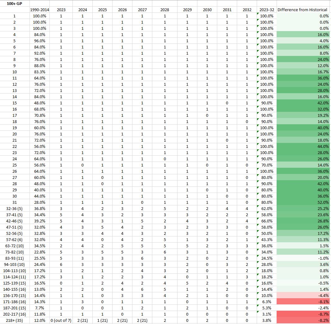 My sim just completed the 2038-39 season so I have a good dataset of drafts and their results. I decided to look at the drafts from 2023 to 2032 and see how many players reached 100GP, because Scott Cullen did the work of analyzing the 1990-2014 drafts last year to gather the same information (see here: https://www.tsn.ca/statistically-spe...lues-1.1119528 ).