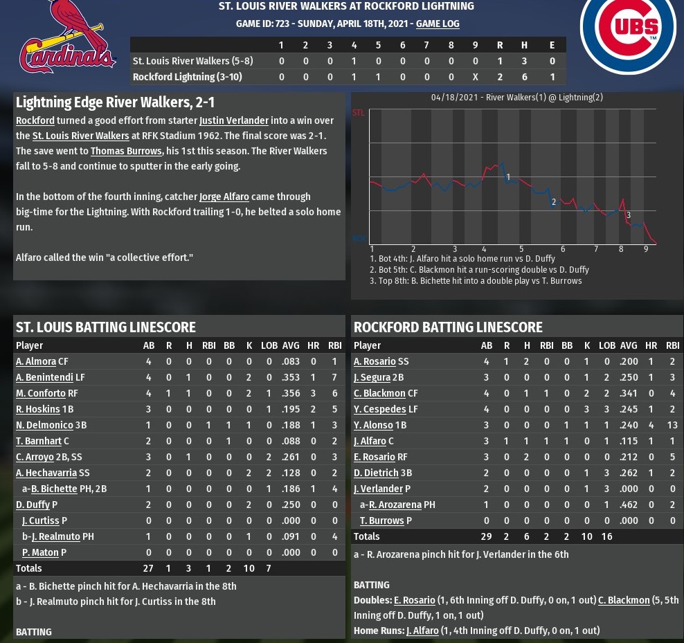 Justin Verlander limited St. Louis to a single run over six innings and Thomas Burrows kept the River Walkers silent over the final two as Rockford won 2-1 at RFK Stadium (1962). With the win, the Thunder split the four-game series with the Walkers. Verlander allowed just two hits in his time on the mound, while striking out six and walking two. Burrows was just as impressive, giving up just one hit in three innings. He whiffed four River Walkers and didn't walk any of them. St. Louis actually took a 1-0 lead in the top of the fourth inning, when Michael Conforto connected for a lead-off double off Verlander. A ground out moved him to third and he scored on a Nicky Delmonico fly ball. The Thunder tied it in the bottom half of the inning on a solo homer from Jorge Alforo off St. Louis starting pitcher Danny Duffy. Rockford scored the game's only other run in the sixth Charlie Blackmon drove it home with a double off Duffy. Amed Rosario scored it after having led off the inning with a single. |