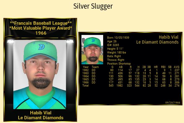 GG for Herve DeLage (perennial winner); George Picot gets the Reliever of the Year Award for the Pitchers; Silver Sluggers go to Julien Henri (P), Jean-Piere Pierson (LF), and Habib Vial (SS) of the Diamonds.