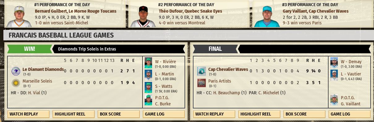 From the Journal of Julien Henri It was like 1966 never ended and we rolled right over to spring. The off-season flew by like one of Cosman' high heaters as I barely had time to catch my breath from the magnificant championship season. Our pitching was dominant today. Total shutdown. The bats were lively as both Herve and picked up a pair of hits. Twice Herve went for extra bases legging out a triple, then a double. I played CF. After the game Herve was being looked at by the trainer. Hopefully, we'll get a diagnosis, soon. He is key to our ball club. Marseille made some noise in the free agent market over the winter. The Soleis let it fly on opening day, too, as they rolled over St. Michel 14-1. A team to watch, for certain. It looks like another great season in the FBL. I'm really looking forward to it.