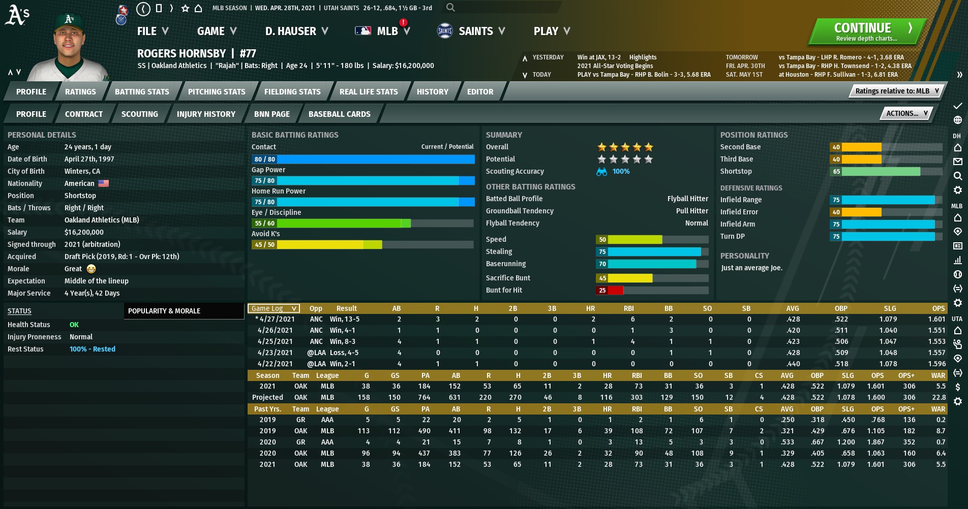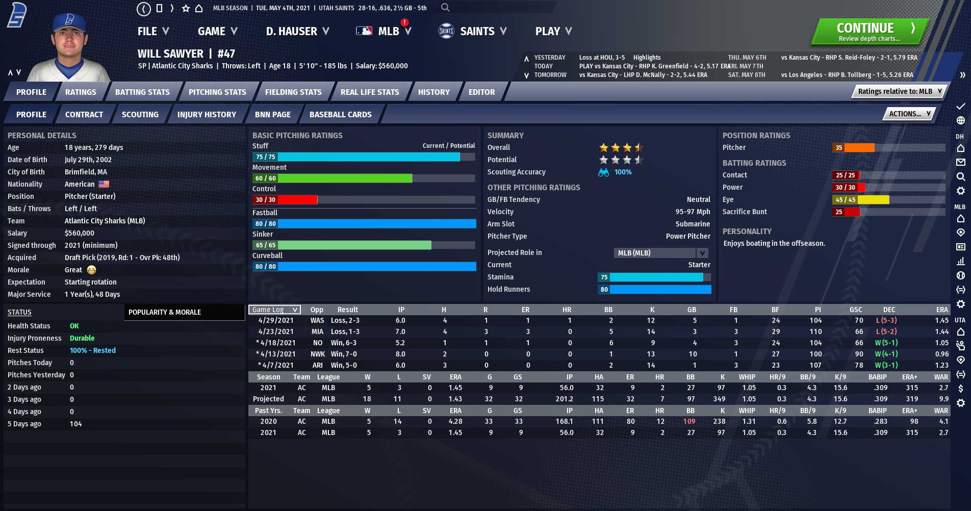 This will be a thread for my 60 team league with the development of the prospect named Tate Redinger. I tried a thread like this but in the midst of it all the OOTP crashed and did not save, so lesson learned. This will give highlights of the 60 team league while providing history of Tate Redinger many months before the end of the 2021 season which is where his draft will take place. The league has 60 teams from MLB using a complete random entry for each player. The league is sticking to tradition with no DH in the NL, no 3 batter minimum for relievers and no baserunner on 2nd base for extra innings. The league is in it's 3rd season which is 2021, Covid came a bit earlier so the major leagues decided to make up lost revenue they would have 30 teams enter over a 3 year period (also allows me to have the whole player universe enter faster) There are 30 teams in the American League and 30 teams in the NL, each league got 15 new teams over the 3 year period In 2019, the AL East expanded with the Buffalo Bisons and San Juan Storm. AL Central - Indianapolis Bulldogs... AL West - Utah Saints (team I control) and Portland Lions. The NL East received the Riverhead Racers and Atlantic City Sharks. NL Central added the New Orleans Zebras while the NL West added the Sacramento Bees and Las Vegas Snake Eyes. The 2020 Expansion was: AL East - Charlotte Spiders AL Central - Des Moines Jaguars and Omaha Eagles AL West - Anchorage Bears NL East - Brooklyn Brawlers NL Central - Tulsa Rattlers and Memphis Cougars NL West - Honolulu Riptides After the completion of many new ballparks, the 2021 expansion was robust with 12 teams AL East - Richmond Gamecocks and Jacksonville Beach Bums AL Central - Mexico City Salukis and Caracas Toros AL West - San Antonio River Kings and Fresno Bashers NL East - Newark Thieves and Hartford Rocketmen NL Central - Mobile Swordfish and Louisville Bats NL West - Boise Parrots and Albuquerue Blackbirds There is not much parity in the league in 2021 but MLB execs expect that to even out over time as drafts with 60 players in it, will force better teams to weaken. Only 10 teams make the postseason so there is a lot riding on the regular season and many teams are out of it, but what is there to do on a September night in Boise but watch a baseball game. The league started in 2019 with expansion teams getting filled out rosters which were converted to musicians, characters, politicians etc... The 2020 expansion so fictional players added as FA's The 2021 expansion relied purely on the player pools and expansion draft. |
