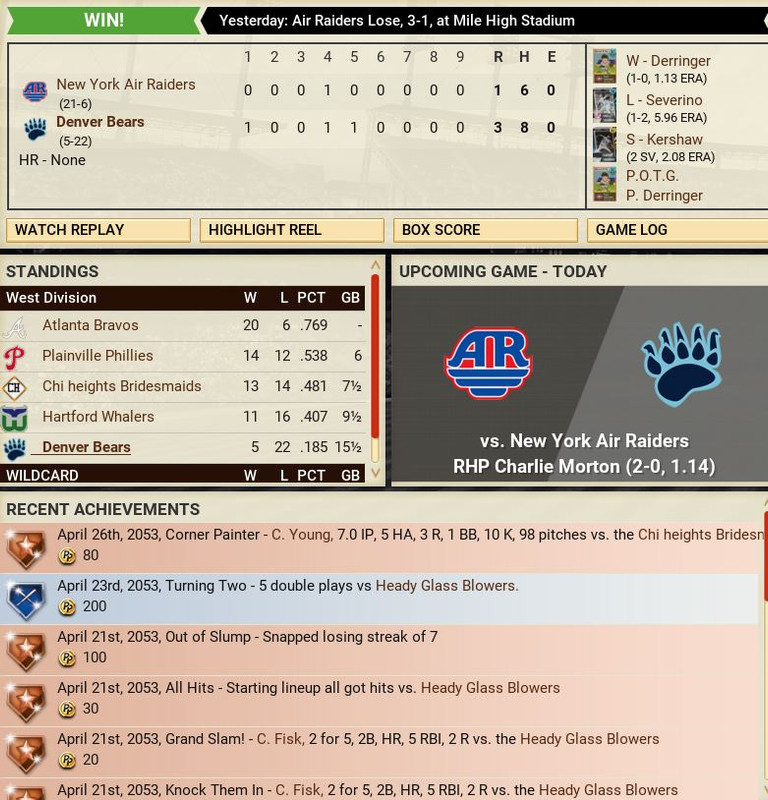 (and 5-time Perfect League Series losers ) Huntley Red Raiders are in P420, where familiar faces are scattered throughout the league. Huntley is in the AC Central this week, and one of its division mates is the Lansing Lugnuts, who, 2 seasons ago, were one of the 4 Sub-League Series teams in Huntley's league. (The Lugnuts are off to a tough start this season so far.)The AC East is home to the 3-time Perfect League champions (and lifetime .716 winning percentage!) Amsterdam Armada, who, back in 2032, won 132 games but fell in the Sub-League Series to waittilnextyear's La Crosse Fighting Frogs, who would go on to win their first Perfect League title against, well, you all know who, so let's move on. Fellow AC East residents Toronto Charmanders and Hartford Whalers are also familiar team names.No team in the AC West is familiar, and none have won a Perfect League title, so the playoff upstart(s) looking to break through will be coming from the AC West! Over in the NC West are the Miami Jeters, who have won at least 93 games 5 weeks in a row and have made the Perfect League playoffs 7 years in a row but have been unable to grab that PL medallion. One of the teams that denied Miami a shot at a title is the Red Raiders, who defeated the Jeters 3-1 in the 2051 P440 Division Series on their way to the championship. This could be Miami's year, though, as no P420 NC team has won a Perfect League title yet. So at least 50% of the finalists in P420 will be looking for a first Perfect medallion! Current standings follow... |