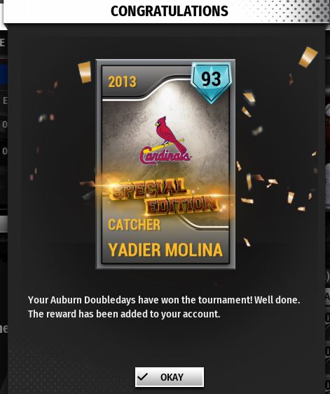 The Daily Super Open has a new Yadier Molina card based on 2013. Only 20 spots to fill and 6 hours to go, so should fill. Hopefully, whoever wins will let us know the stats because there's not much difference between 2013 and 2012 (the year the current card is based on and retails for 30K). Twice as many doubles and half as many home runs and fewer stolen bases, but otherwise much the same. It would be interesting to see if the 2013 SE card is juiced for contact rating.