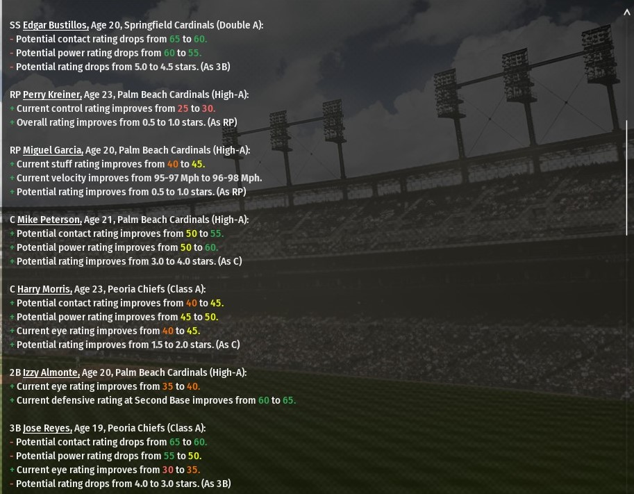 They then swept defending champion and 2025 NL North champ Chicago in three games in the NL Championship Series. The World Series was a dogfight with Akron. The Walkers needed a two-out home run from Carlos Vidal in the bottom of the ninth inning of Game 6 to force extra innings. They eventually won 8-7. Game 7, however, was a cakewalk as St. Louis routed the Flying Feet 10-0 to earn its first championship since the inaugural season of the Midwest Baseball League in 2018. Once again, led by Alex Faedo (15-5, 2.88 ERA), the St. Louis rotation was among the best in the league. Argenis Batista (12-7, 2.83) and Steven Brault (11-7, 3.59) also cracked double-figure wins. Aaron Civale also went 3-2 with a 3.27 ERA after being acquired just before the trade deadline. The bullpen was not bad either. Edwin Diaz earned 24 saves and posted a 1.76 ERA while Jake Brentz was 9-3 with 18 saves and a 1.07 ERA to help earn him NL Reliever of the Year award for the second consecutive season. Offensively, the Walkers were improved from a mediocre 2024 campaign but still ranked near the middle of the pack in most areas. Second baseman Bo Bichette (.343, 21 HRs, 56 RBIs, 70 runs) had one of his best seasons at the plate. Acquired in a trade just before opening day, outfielder Carlos Vidal proved to be a key cog hitting .265 with 26 homers and 66 RBIs. While they are not what they used to be left fielder Andrew Benintendi (.330, 19 HRs, 75 RBIs) and first baseman Rhys Hoskins (.243, 28 HRs, 84 RBIs) continue to be major contributors. Shortstop Jean Carmona (.265, 11 HRs, 57 RBIs) and catcher Jared Thomas (,253, 18 HRs, 66 RBIs) are both young players who both may soon be among the best at their positions. The roster will look much the same in 2026, outside of one major addition. An off-season trade with Cleveland landed St. Louis All-Star third baseman Fernando Tatis Jr. The 27-year-old Tatis batted .265 with 29 homers and 71 RBIs in 2025. He came at the cost of starting third baseman Tanner Kohlhepp (.261, 17 HRs, 63 RBIs) along with a pair of highly touted prospects closer Adam Wenger and third baseman Edgar Bustillos. Bustillos was ranked as the game’s No. 8 position player prospect at the time of the trade. With the addition of Tatis Jr., and his $17.7M per season salary, the River Walkers payroll jumped from 12th at the end of last season to 2nd going into the 2026 campaign. Much of that came from huge arbitration payouts, close to $30 million over nine players, along with the fact many of the other teams seemed to decide not to spend in the offseason. Departures 3B -- Tanner Kohlhepp, 26, B-R, T-R, 152 G, .261 BA, 17 HRs, 63 RBIs, .732 OPS (Traded to Cleveland) Kohlhepp did a fine job at third base during the championship season starting 145 games and all but one in the postseason. He’s a good defender and has some pop. But he’s not the equal of Tatis in either category, making the trade impossible to make once the opportunity arose. SP -- Aaron Civale, 30, B-R, T-R, 5-3, 3.82 ERA, 13 Gs, 77.2 IP (Signed as free agent with Columbus) Acquired in a trade with Green Bay just before the August 1 deadline, Civale had a strong final two months for the Walkers. He also was 1-1 with a 0.73 ERA in postseason starts, including being the winner in Game 7 of the World Series against Akron. LHP – Dan Jennings, 38, B-L, T-L, 2-2, 3.44 ERA, 1 Sv., 63 G, 49.2 IP (Signed as free agent with Akron) Jennings did a fine job and was the team’s No. 2 lefty most of the season until Hill made his late -season run. However, his age seemed to make it a risk to bring him back. OF – Alek Thomas, 27, B-L, T-L, 129 G, .287 BA, 4 HRs, 29 RBIS (Signed as free agent with Dayton/currently in minors) Thomas emerged as a top pinch-hitter in the Walkers’ World Series campaign after rookie Larry Ernesto claimed the role of the team’s primary center fielder. He got on at a nice clip, .349 OBP, and is a good defender. But his lack of power led to him being cut loose. C – Reese McGuire, 31, B-L, T-R, 17 G .175 BA 0 HRs, 4 RBIs (currently a free agent) Did what he was paid handling the catching duties the rare days Jared Thomas did not start. He was a good clubhouse leader, but brought very little to the plate. IF – Christian Arroyo, 30, B-R, T-R, 135 G, .200 BA, 0 HRs, 10 RBIs (currently a free agent) A dependable infield reserve for the Walkers since the 2020 season, Arroyo’s bat simply went dead in the 2025. There were players who can play multiple positions available who were better hitters, which left Arroyo without a contract. Starting rotation SP1 – Alex Faedo, 30, B-R, T-R, 15-5, 2.88 ERA, 33 G, 31 GS, 200.0 IP Faedo not only is the Walkers’ ace, he also is one of the top pitchers in the game. He’s won 13 or more games each of the past three seasons but also seen his ERA drop during each of them. He averaged more than strike out per inning (9.7 – K/9) and boasted a 1.03 WHIP. He’s a free agent after the season, so it will be interesting to see how this plays out. SP2 – Argenis Batista, 25, B-L., T-L, 12-7, 2.83 ERA, 24 G, 24 GS, 146.1 IP Batista may have been the best pitcher going in the NL when he was felled by an oblique strain on July 13 which sidelined for seven weeks. When he came back, he nary missed a beat until suffering an elbow injury in Game 6 of the World Series. He dealt with a back issue during spring training, so injuries are becoming an issue. But when healthy, Batista is one of the best lefties in the game. SP3 – Adonis Medina, 29, B-R, T-R, 3-6, 3.26 ERA, 12 G, 12 GS, 66.1 IP The River Walkers didn’t get to see much of Medina in 2025, as he missed nearly four months with a shoulder injury suffered on May 27. He did get back on the mound in September but was left off the postseason roster. He got through spring training without incident, and the Walkers brass is hoping he can pitch like he did when he was a member of the starting rotation in Detroit. SP4 – Steve Brault, 33, B-L, T