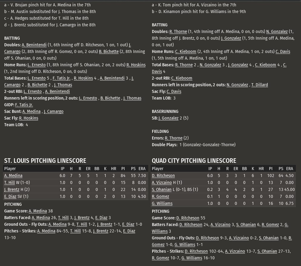 Down 5-3, St. Louis took control with four runs in the top of the eighth inning highlighted by a three-run homer from Larry Ernesto, as the River Walkers downed Quad City 7-5 at Fenway Park (1970). With the win, the River Walkers took two of three games in their season-opening series against the Thunder. Bo Bichette greeted Q-C reliever Sarkis Ohanian with a double. Ohanian followed it with a walk to Carlos Vidal. It looked like QC may wiggle out of it when Fernando Tatis Jr. hit into a double play. But Andrew Benintendi drove in the inning's first run with single. A walk to Hoskins put two runners aboard. Ernesto followed with this three-run shot, a 348 liner over the right-field wall. Tied 1-1, the Thunder had gone up 3-1 in the fourth on a two-run homer from Carter Kieboom off Walkers starter Adonis Medina. An inning later, Chase Davis got to Medina for another two-run shot, making it 5-2. Tatis drew a one-out walk from Q-C starter Daniel Ritcheson in the sixth and later scored on a Rhys Hoskins fly out, a Benintendi double had placed him at third, to make it 5-3. Medina worked the first six innings for St. Louis, allowing five runson seven hits. Tim Hill, Jake Brentz and Edwin Diaz worked a scoreless inning apiece. Hill (1-0) got the win. Diaz notched save No. 1. |