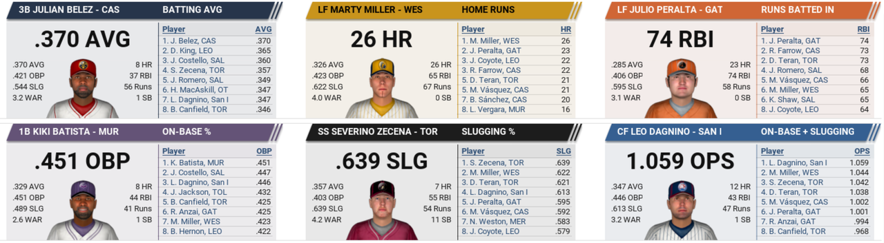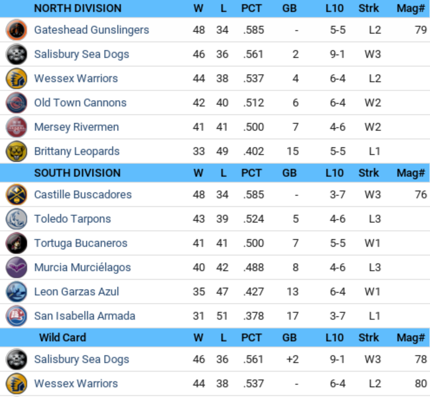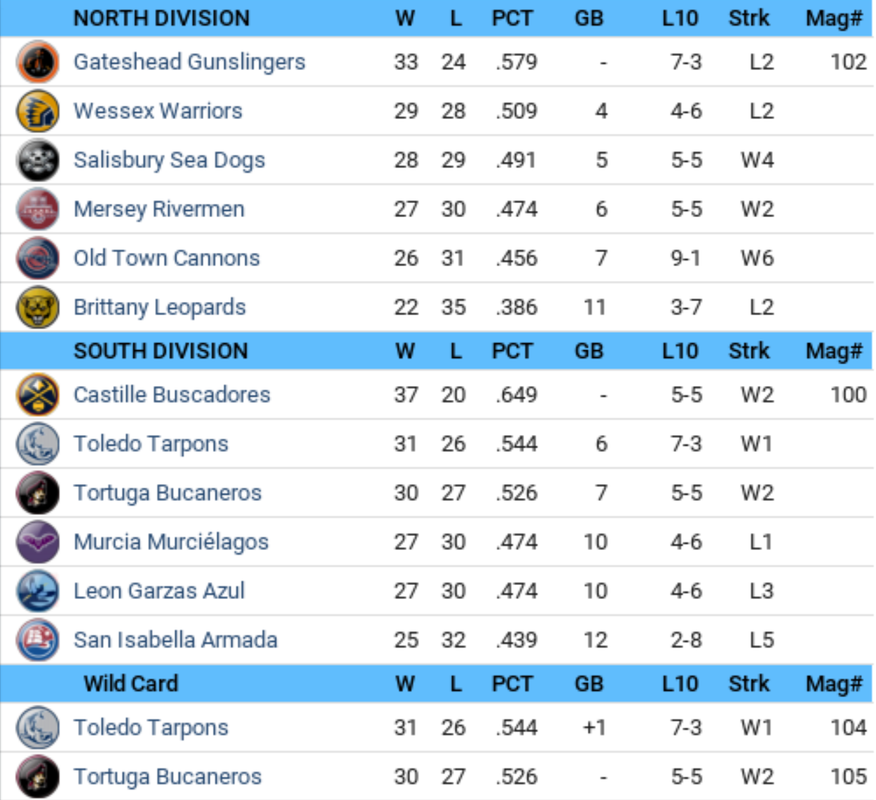 ![]() Lots of movement in month 2 of the Andros Baseball League. Wessex lose top spot in the north division while San Isabella fall to the basement of the south division. The gap widens between 1st and second spot in each division. Castille Sweep Player Awards for May Castille Shortstop ABL's Best Batter in May: Robby Farrow has a lot going for him. The Castille shortstop just broke into the majors this year and now the Andros Baseball League has just picked him as its top hitter for May. In 28 games last month this outstanding rookie batted .402 with 11 home runs, 39 RBIs and 24 runs scored. This season Farrow has hit at a .352 clip with 55 RBIs, 17 home runs and 42 runs scored. Andros Baseball League #1 Hurler is Cabrera: Ráyman Cabrera took a much-deserved turn in the spotlight earlier today as he accepted the Andros Baseball League Pitcher of the Month award for May. The 21-year-old Buscadores starter is a relative newcomer to the league, but nonetheless racked up an impressive 5-0 won-lost record in 7 starts. This month he fanned 23 batters in 59.1 innings and compiled a 1.06 ERA. To date this season, Cabrera has a record of 9 wins and no losses and a 1.35 ERA. He has appeared in 13 games and struck out 43 in 107 innings. Cabrera Picked ABL's Premier Rookie: Ráyman Cabrera has become a big Castille fan favorite, especially during the last month when the pitching phenom racked up a 5-0 record, making him the easy choice for May's Andros Baseball League Rookie of the Month Award. He notched 23 strikeouts in 59.1 innings as he compiled a 1.06 ERA and held opponents to a .200 batting average. Checking out his stats for the season, Cabrera has racked up 9 wins and no losses in 13 starts, 1.35 ERA and struck out 43 batters in 107 innings. Major Injury Report: Season-Ending Injury for Vargas: Team officials for the San Isabella Armada confirmed that a torn rotator cuff will force Jordi Vargas to miss the rest of the season. Vargas sustained the injury on 05/07/2020. It remains to be seen who will replace Vargas on the active roster. Thus far this season, Vargas has worked 56.1 innings with 13 strikeouts en route to a 4-2 record and a 3.04 ERA. Injury Derails Season for Yang: Obviously disappointed, Eduardo Yang confirmed today that his season is officially over. The Mersey starting pitcher offered mostly monosyllabic responses to reporters. "Nope," he said, when asked if he might possibly return this year. The 35-year-old Yang suffered a torn labrum on 05/26/2020 and has been out of action since. For the year Yang has compiled a 4-3 record with a 4.00 ERA. Hutchinson Has Season End: The news was not unexpected, but that didn't make it easier to accept for the Murcia Murciélagos: starting pitcher Chad Hutchinson is out for the year. Hutchinson suffered a torn flexor tendon in his elbow on 05/11/2020. The team knew that the chances of seeing him return were slim to none. But today it was made official. Checking out his stats for the season, Hutchinson has racked up 2 wins and 3 losses in 7 starts, 5.08 ERA and struck out 8 batters in 44.1 innings. Major Game Performances: Costello Batters Old Town Big Time: It was a parade of hits for Joseph Costello of the Salisbury Sea Dogs at Salisbury Grounds today. Connecting almost every time he went to the plate, Costello finished the day with a total of 5 hits in 5 at-bats. His strong individual effort propelled the Sea Dogs to a 10-1 victory. "Costello was really good and we were really bad," groaned Cannons manager Riley McFarlane. "Next time he's that hot, we'll just walk him." Joseph Costello singled in the 1st, singled in the 3rd, singled in the 5th, singled in the 7th and hit a two-run double in the 8th. A look at his season totals shows Costello with 1 home run, .357 BA, .427 OBP, 14 RBIs and 21 runs scored. First two Cycles hit in ABL history! Hit Parade: Dagnino Gets Cycle: Today at Ballpark of Murcia Leo Dagnino tore up Murciélagos pitching, but the Armada still came up empty. Murcia whipped them 7-6, despite his best efforts. The San Isabella center fielder hit for the cycle with a 4-for-5 day and collected 2 RBI and scored 2 runs -- but to no avail -- his team lost the game anyway. Leo Dagnino doubled in the 1st, hit an RBI single in the 3rd, tripled in the 5th, struck out in the 6th and hit a solo-shot off Ponce Colon in the 8th. Currently Dagnino has 7 home runs and a .372 batting average. Guevara Hits for the Cycle: Jorge Guevara punished the Wessex Warriors today, leading the Rivermen to a 9-4 win. In doing so, Guevara hit for the cycle, tagging the Warriors for 4 hits in 4 at-bats. A player hitting a single, a double, a triple and a home run in the same game is one of the more unusual feats in professional baseball and typically happens only a couple times per season. "Well, I didn't expect that to happen," the Mersey center fielder said after the game. "I got some great pitches and I hit their mistakes." Guevara also had 2 RBI and 4 runs scored in the game at Warriors Ballpark. Jorge Guevara hit a solo-shot off Clement Beltre in the 1st, doubled in the 3rd, hit an RBI triple in the 5th, walked in the 6th and singled in the 8th. Batting .320 to date, Guevara has 1 home run and 3 RBIs. Archelirion, I'm just laughing at this point. ![]() Song of the day: Lucky Sometimes - Pokey LaFarge https://youtu.be/kIl3qO3MRGM Pokey LaFarge is a musician, songwriter, bandleader, entertainer, innovator and preservationist, whose well-rounded arsenal of talents has placed him at the forefront of American music. His music transcends the confines of genre, continually challenging the notion that tradition-bearers fail to push musical boundaries. I saw him perform at a house party down the street from my house about a year ago, he was amazing to say the least! Very talented vocalist and musician. ![]()