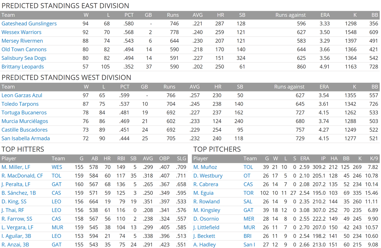 Preseason predictions says Leon will have the best record on the island, while Brittany drags the bottom with 57 wins on the season. Marty Miller could claim the Most Valuable Player award if he achieves his predicted season while Marco Munoz could top the Hurler of the Year Award with 21 wins for Toledo. ![]() ![]() ![]() The Prospects Pipeline has been published for the upcoming season, ranking the best young talent on the island with some scouting marks for each player. Fans are filled with excitement when they see their young players take the field for the first time under the lights. ![]() The 2020 Androsian Baseball season is coming up next!