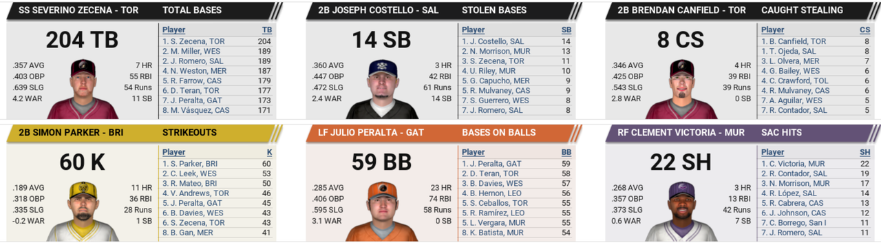 ![]() League Transactions: Castille-Wessex Trade: Ohara for García: It came down to the last hour of a self-imposed trade deadline, but the Castille Buscadores and Wessex Warriors finally came to an agreement on a trade that had been rumored for weeks. The trade sends Castille's 25-year-old 2B Agustin Ohara to Wessex in a swap for 27-year-old RHP Ricardo García and 17-year-old minor league 1B Dan Rumsey. Both GMs seemed relieved that the deal had been completed with one stating, "We had to set a deadline to get it done." The players are expected to report to their new teams by tomorrow. Ohara is hitting .297 this year with 6 home runs and 47 RBIs. He also has an OBP of .355, 39 walks and scored 62 times. García has taken the mound for 18 relief appearances this season, nailing down 7 saves while notching a 4-8 record with a 4.99 ERA. The Castille reliever has limited opposing batters to a .269 batting average. ![]() ![]() San Isabella Armada Ship Alexander to Mersey: Both sides appear content with the trade finalized today that will send 28-year-old minor league RF William Alexander to the Mersey Rivermen, while the San Isabella Armada will receive 29-year-old 2B Milton Vazquez and 23-year-old minor league 3B Michael Díaz. "This is a move that filled a few gaps in our roster," said Eddie Sharp, Armada general manager. For his part, the Rivermen GM said the trade was made "in the best interest of our organization's future." BNN analysts reported that on paper the trade seemed to be a plus for both ball clubs. The players involved are expected to join their new teams for the next scheduled game. Currently Alexander is batting .278 with 7 home runs, 27 RBIs and 22 runs scored. This season Vazquez is hitting .265 with 3 home runs. ![]() San Isabella-Leon Trade: Ashford for Thai: Done deal! The San Isabella Armada have agreed to send 33-year-old 3B Martin Ashford and 24-year-old RF C.J. Jeronimo to the Leon Garzas Azul for 37-year-old minor league RF Josu Thai. The trade, rumored for days, was completed in the wee hours this morning. Ashford is currently hitting at a .302 pace with 6 home runs, 57 RBIs and has scored 54 times. ![]() Game Performances: Capote 5-for-5 for Leopards: The Brittany Leopards stopped the Wessex Warriors by a score of 5-0 at Warriors Ballpark today, with the lion's share of the credit going to left fielder Carlos Capote. The 23-year-old had a career day, collecting 5 hits. "Every batter wants to have a quality at-bat every time he steps up to the plate," Capote said later. "He wants to hit the ball hard." Capote did just that in his 5 at-bats, much to the chagrin of the Warriors. "Not much that I can say," offered Wessex manager Tomy Peralez. "He just hammered the heck out of us." Carlos Capote singled in the 1st, hit an RBI triple in the 3rd, singled in the 4th, singled in the 6th and hit an RBI double in the 7th. This year Capote is batting .328 with 4 home runs. ![]() BOOM-BOOM-BOOM-BOOM! 4 HR for Wright: The only thing better for Badger Wright than hitting 4 home runs in a game would have been hitting them in a win. Wright put up a monster display of hitting for the Wessex Warriors but had it spoiled as the Toledo Tarpons pulled out a 10-7 win. "Ten years from now," Wright said, "I'll probably look back on this day with more satisfaction than I feel right now." On his historic day at Warriors Ballpark, the Wessex second baseman belted 4 home runs and put up a 4-for-4 line. He scored 4 times and had 7 RBIs. Badger Wright hit a two-run home run off Gervasio Taveras in the 1st, hit a solo-shot off Gervasio Taveras in the 3rd, walked in the 5th, hit a three-run home run off Gervasio Taveras in the 7th and hit a solo-shot off Cesar Cunnington in the 9th. This season Wright is batting at a .317 clip with 11 home runs and 65 RBIs. ![]() Miscellaneous Baseball News: Tarp Trip More Serious Than Thought for Hong: What seemed comical at the time has turned out to be no laughing matter for Dario Hong of the Rivermen. The closer joked with teammates after stumbling over the renegade tarp and twisting his left ankle. However, the ankle swelled over the next few days and tests revealed Hong had actually suffered a high ankle sprain. The revised diagnosis is bad news for Mersey, since it means Hong may be out for a month or more. The Rivermen are currently at 46-45 and in 5th place in their division. Asked if the team may need to explore trade options, manager Virgilio Salvador said, "It's too early to tell at this point. We'll have to cross that bridge when we come to it." Salisbury Players Find Life After Poker: There's more to a good clubhouse than an available poker game, members of the Salisbury Sea Dogs have found out. Only a short time after manager Pascoal Gómez banned poker games from the clubhouse in an effort to improve his team's focus, some members of the team are saying the move had a positive impact on the clubhouse. "We probably did spend too much time playing cards," said Agustin Rivera. "Guys are actually just talking to each other more, and I guess we're talking about the game and our opponents more to." Leandro Longoria was a vocal opponent of the skipper's decision to ban poker games and while he said he's still not overly pleased about it, it's not the worst thing in the world. "I always lost money in those games anyway," he said. Monthly Player Awards: Belez Claims ABL Batter of the Month Award: For a rookie just breaking in, Julián Belez certainly put together a successful month. It was good enough to win the ABL Batter of the Month award for July. The 27-year-old third baseman for the Castille Buscadores hit .441 with 6 home runs, 20 RBIs and 26 runs scored. This season Belez has banged out 149 hits in 381 at-bats for a .391 average with 14 home runs. He is getting on base at a .443 pace and his totals also include 57 RBIs and 82 runs scored. ![]() Eguia Nabs ABL #1 Pitcher Trophy: Any time a rookie makes a splash on the scene, it's got to be great 