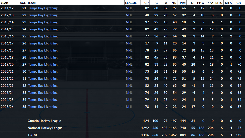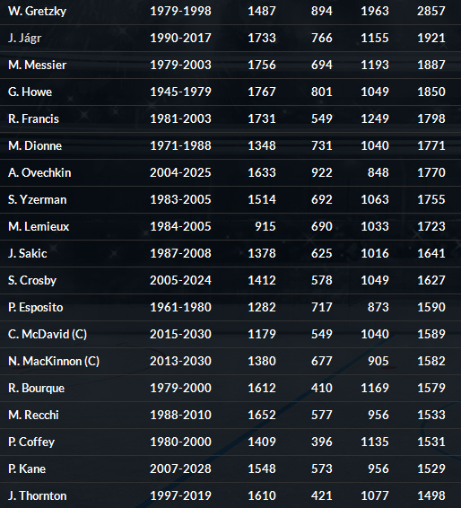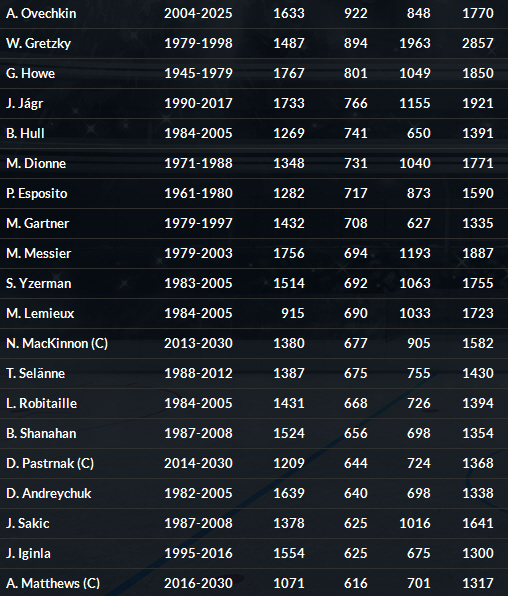 This time 3 players with more than 100 points and 3 with more that 50 goals. Little surprise by Art Ross. Nathan MacKinnon, 40 years old, won it with 111 points (33+78). Another oldie, 38 years old Auston Matthews, had 77 points. 39 years old Connor McDavid with 60 points. Regular season was not great, only 99 points and goal difference only +31. Overall it was 7. best record in the league. Lost in 1. round. Stanley Cup won by Buffalo Sabres. They made a interesting move before the season. Signed a 30-years old goalie from KHL Andrei Nikulshin. He played one season in NHL before, but was mostly in KHL. And suddenly they won Stanley Cup with him, and he won Vezina, Jennings and Conn Smythe. Nathan MacKinnon retired Hart Trophy: 4 Maurice Richard: 3 Art Ross: 3 Stanley Cup: 1 World Championships Gold: 2 World Cup Gold: 1 1664 regular season games: 818 + 1124 = 1942 158 playoff games: 68 + 105 = 173 Also retired: David Pastrnak (757 goals, 1629 points). |