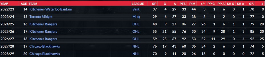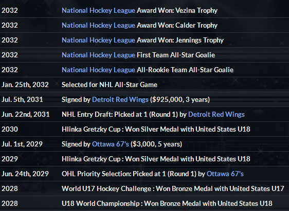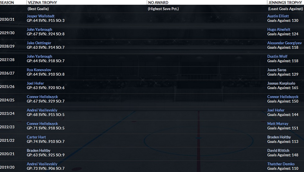 Again – 62 wins and 129 points. But only 301 GF. Connor McDavid had fantastic season with 130 points (51+79) and GR 84. 36 years old Nathan MacKinnon has now 722 goals. Also very good season with 97 points. Overall, there are only 3 players with 100+ season and only 2 with 50+ goals. There are 2 defensman with 26 goals (Aron Kiviharju and Luke Hughes). What is strange,m one of this guys was also -20. Was blessed with first overall pick in 2031 draft thanks to trade. Picked a goalie Ben McGrogan and it was a jackpot. In his rookie Season he won Calder, Vezina and Jennings Trophy. Unfortunately, no Stanley Cup. This time the end was already in second round. |