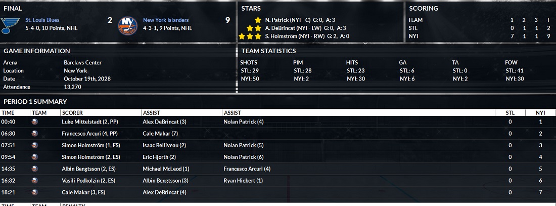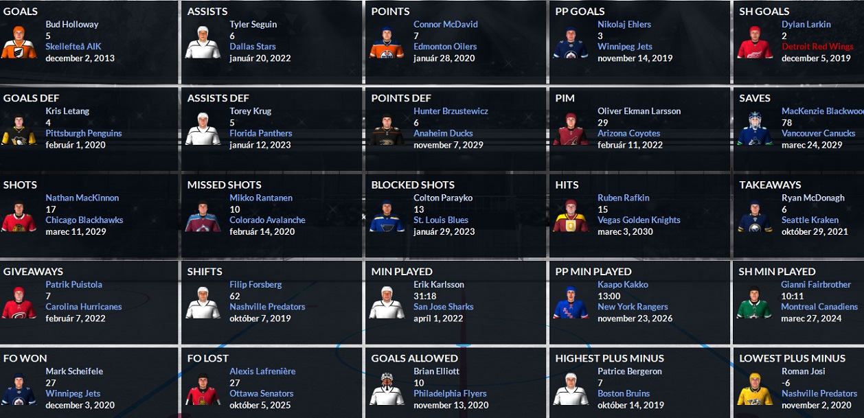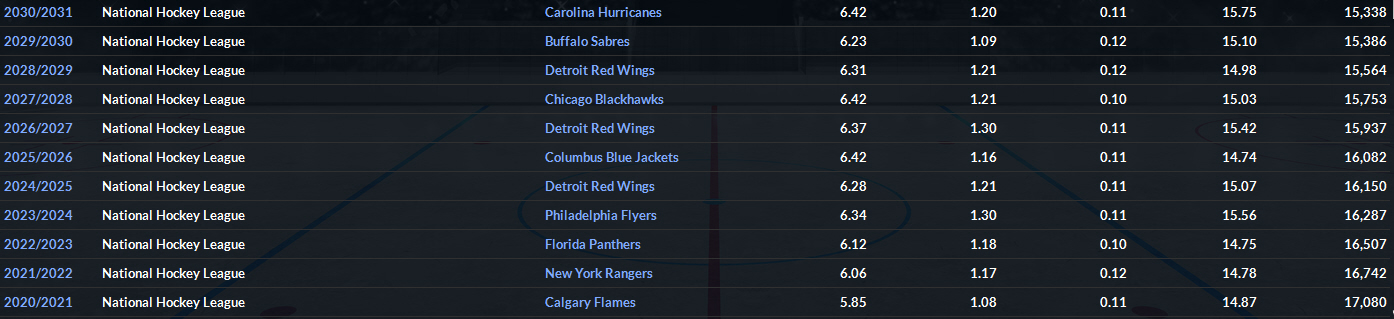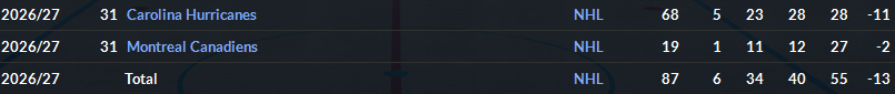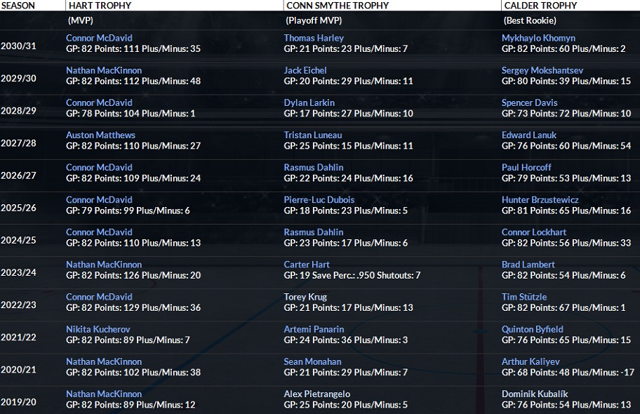 Only 104 points, 48 wins, 284 Goals for. That means not so great regular season. Auston Matthews, Nathan MacKinnon and Connor McDavid still among the top 5 in the league. And they are 35+ years old. Where are the young gyus? 505 hits, 202 shots blocked, 12 fights, 288 PIM and 31 points. That are some good numbers for a defensman. 23 years old Czech D Jan Zika. That name i must follow. Another Stanley Cup, this time with 4-0 win in the finals vs Oilers (rematch of 2026/2027). And that also without Shane Wright, who was injured in second round. Poor Connor McDavid still without Stanley Cup. Ben McGrogan with second Vezina in the row. |