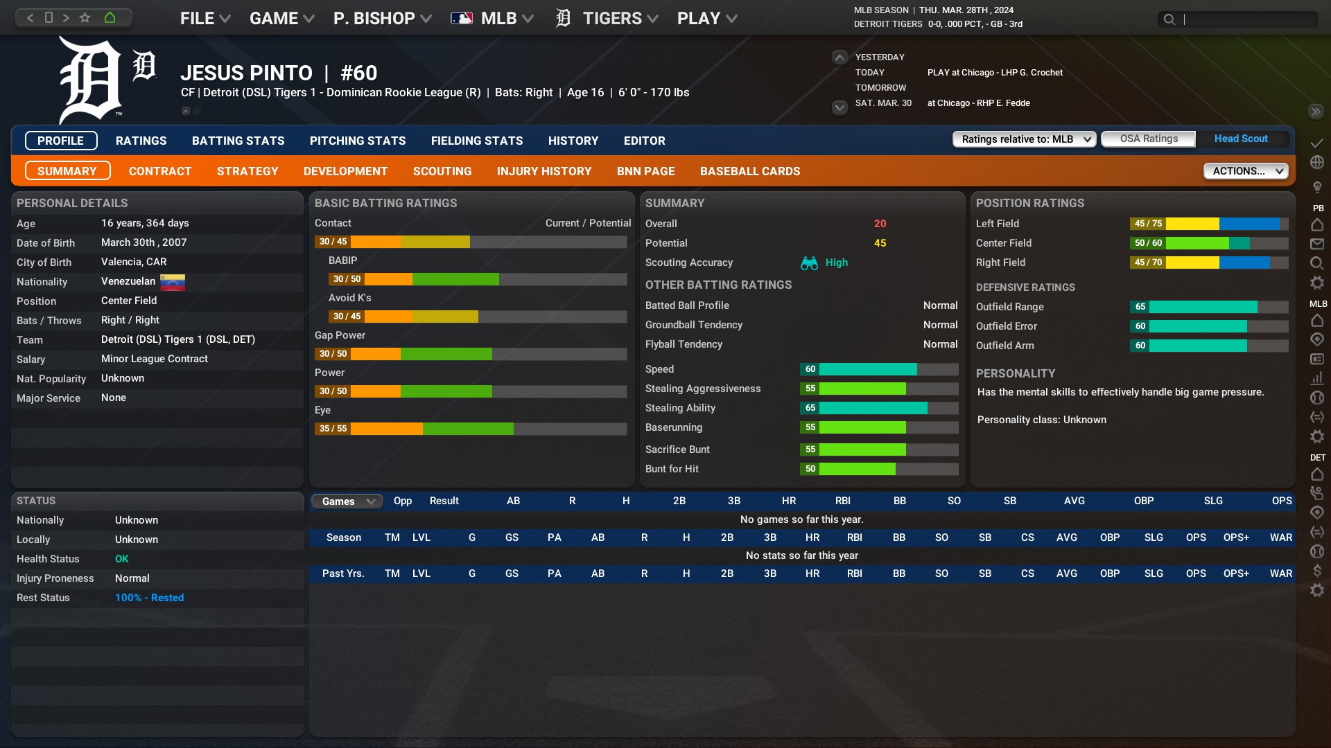 Hello I’m Price Bishop and I’ll be the GM/Manager of the Detroit Tigers. This team interests me due to the fact it’s been 9 seasons since their last playoff appearance, tying them for the longest such streak with the LAA. Also I’m in a dynasty fantasy baseball league and I own a few Detroit players, most notable being Tarik Skubal. I don’t have any “house rules” but will try and keep the game close to realistic as possible, biggest example of this would be not cheesing the AI trade logic and just over trading in general as that’s not reflective of how baseball organizations are run. I will be playing out every game myself to ensure the team plays the way I want and that my players are being used appropriately and as envisioned.