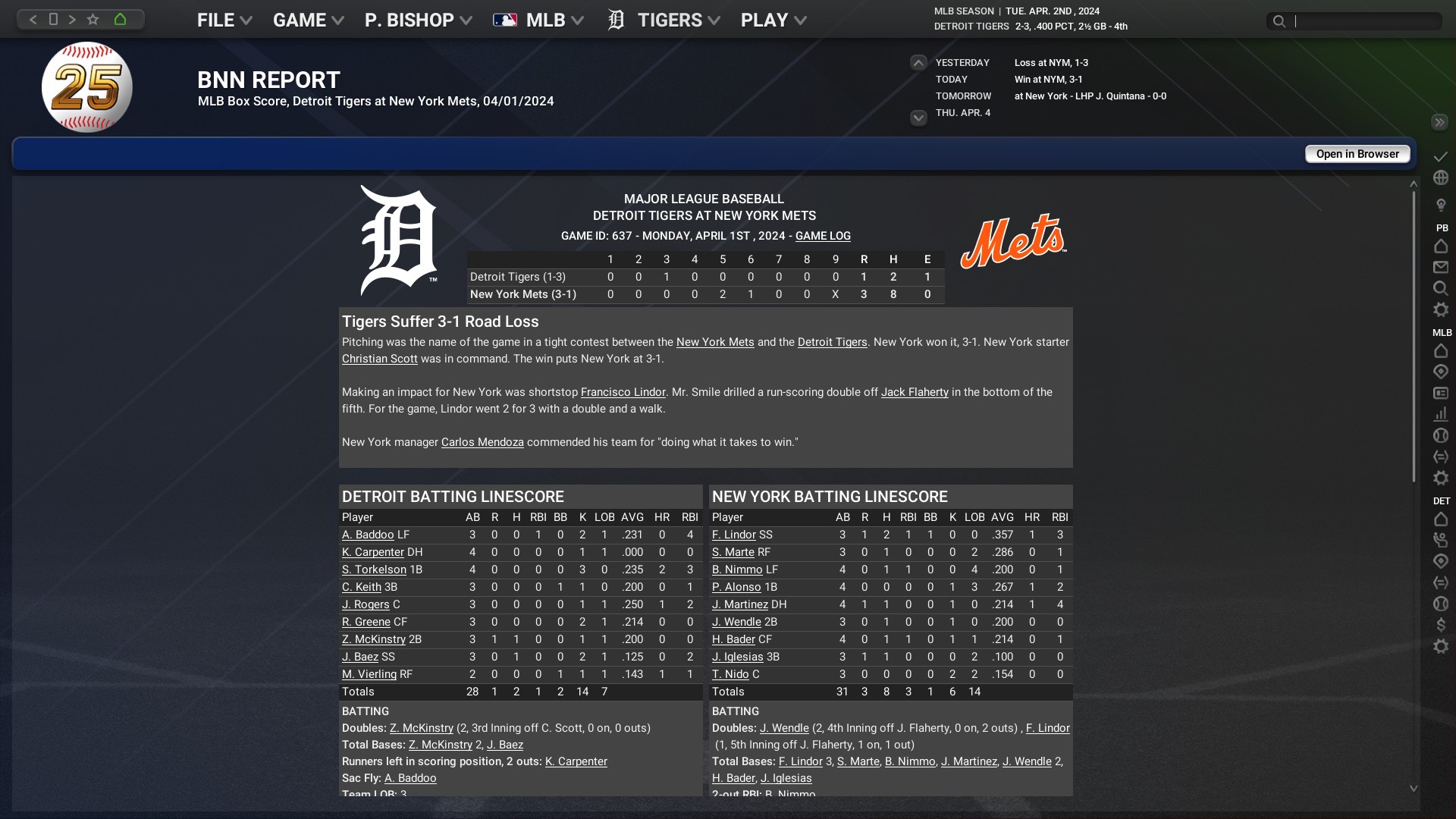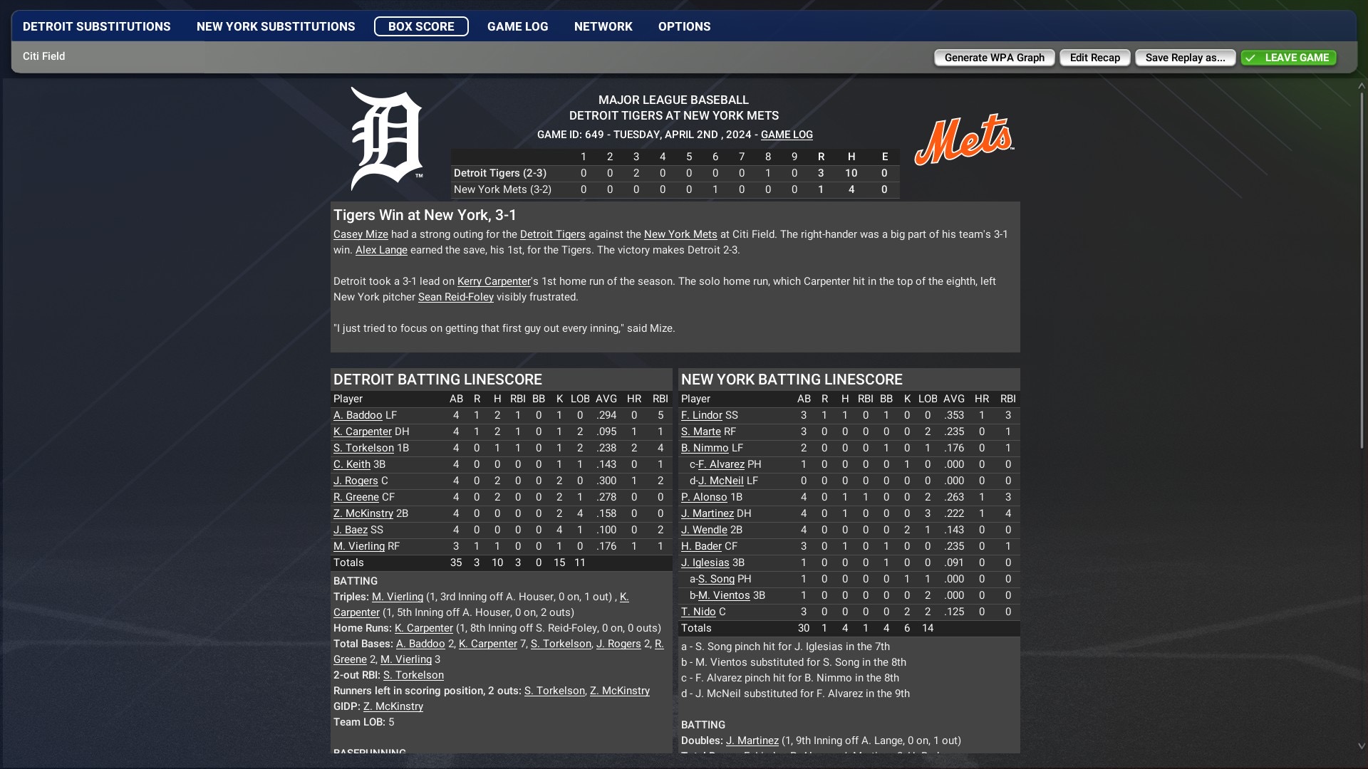Unfortunate to start the season off on the losing end but at least we managed to win the finale to get our first W on the year. Up next for the 1-2 Tigers is a 3 game series at the 2-1 New York Mets.