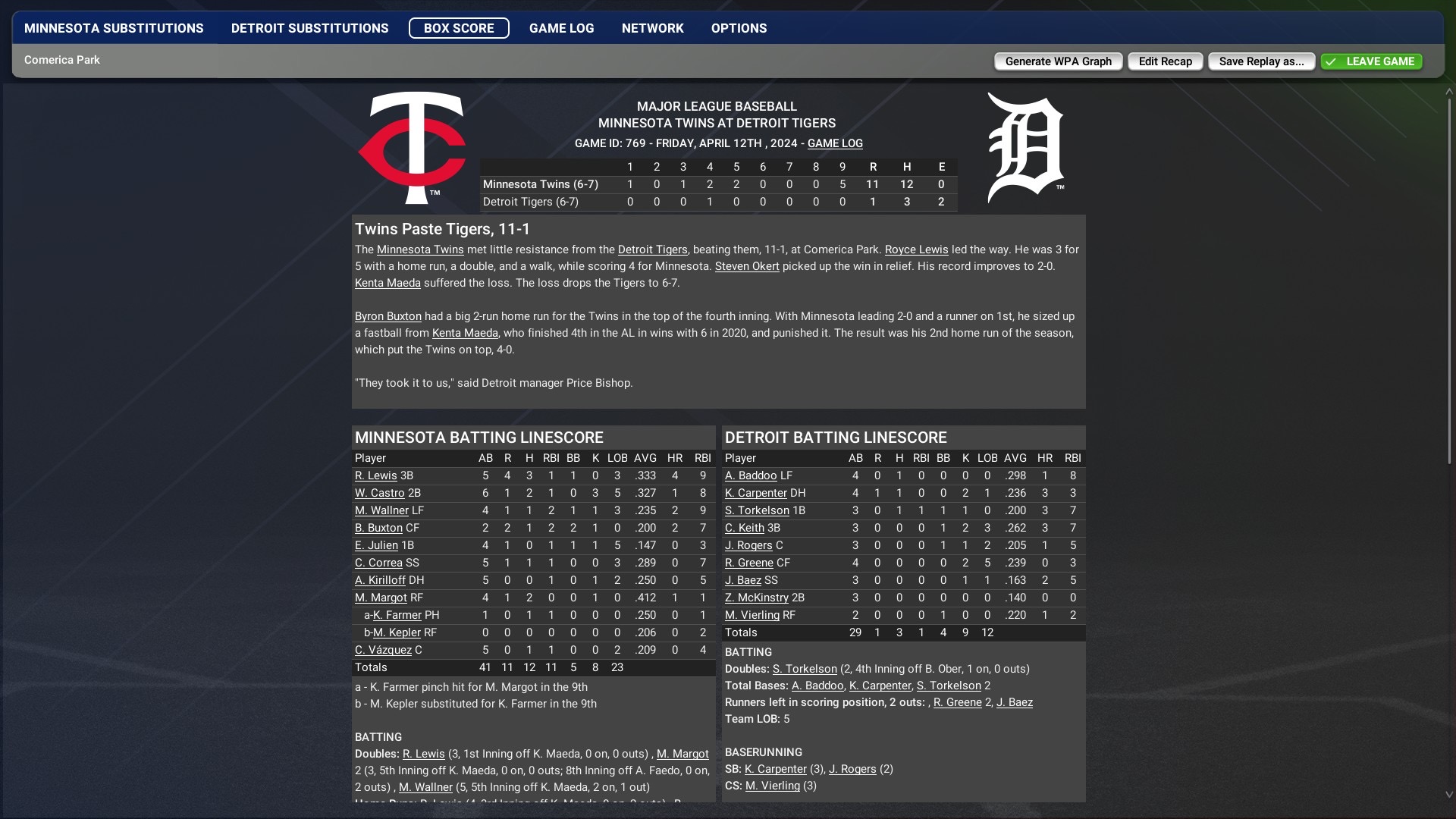 Ugly series for the Tigers losing 1-2 and getting outscored 35-8. Tigers fall to 12-13 on the year and will host 10-16 Kansas City for 3 games.