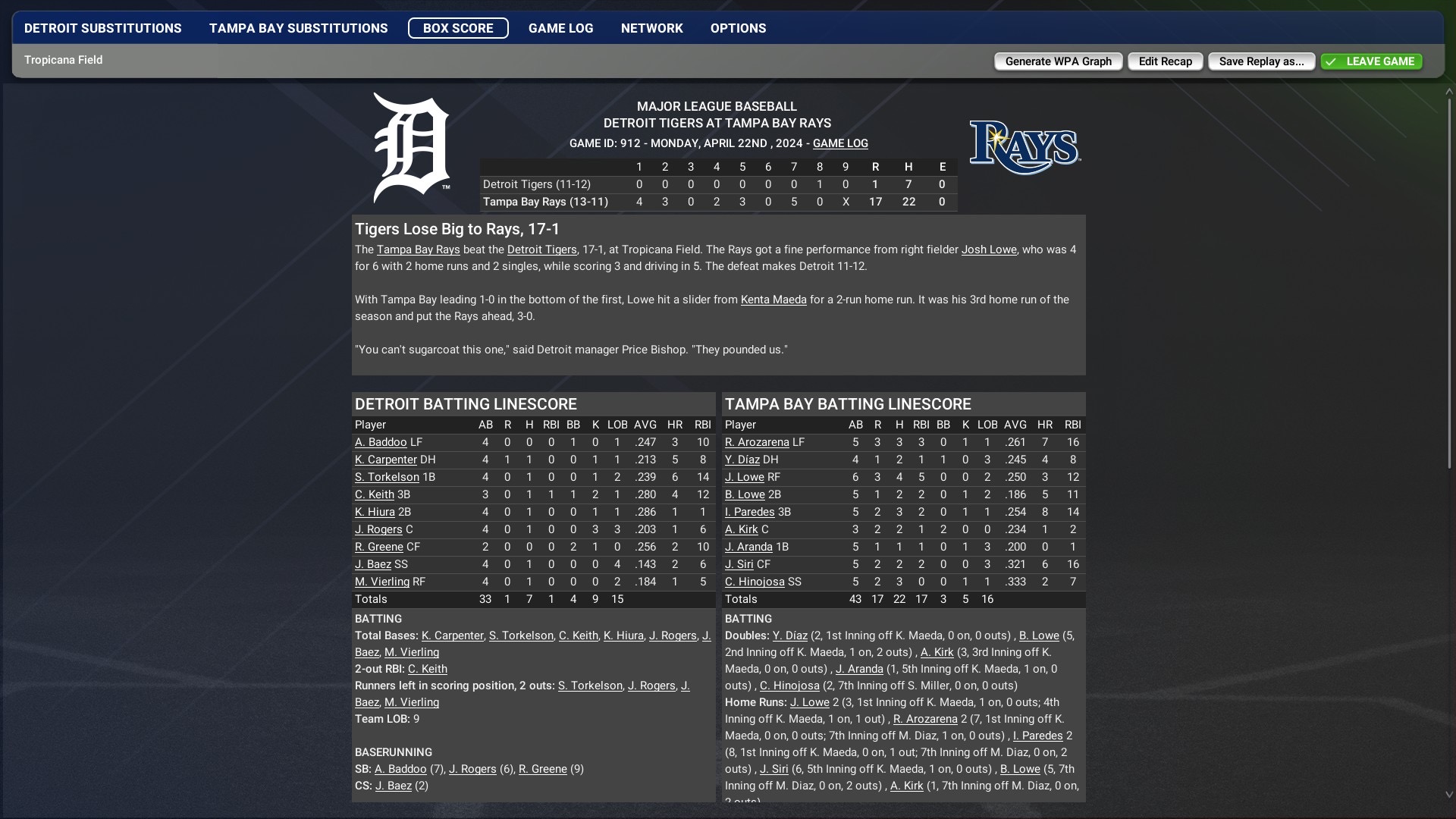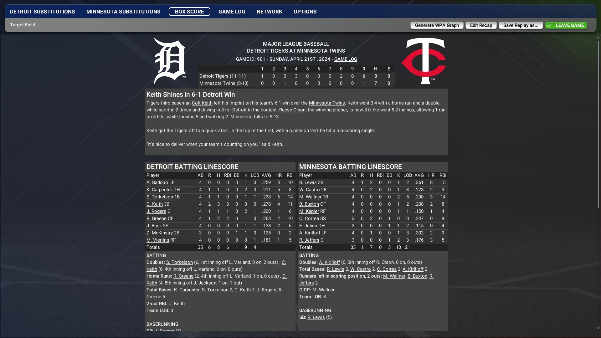 Game 1 Tigers win 13-6