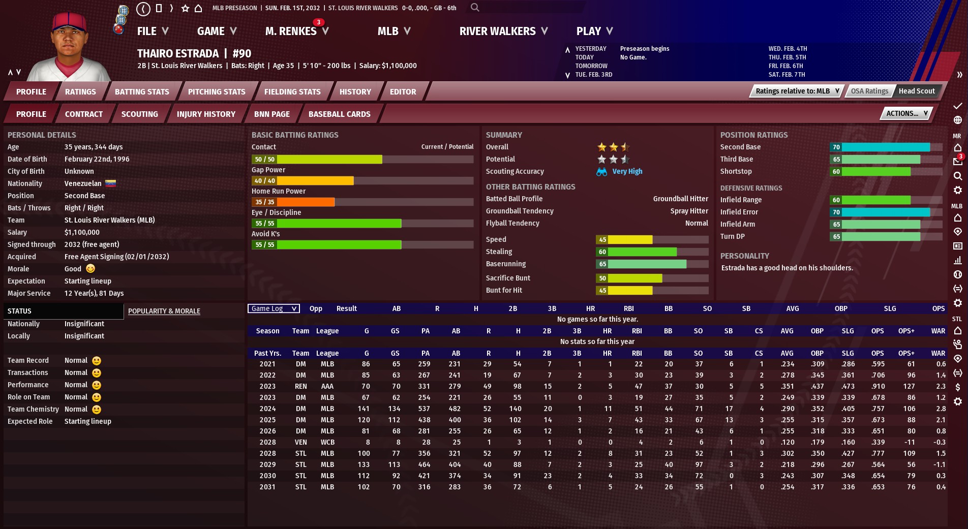 They were certainly that in 2031, going 97-65 to make the playoffs by winning the National League South Division for the second consecutive season and the third time in four years. The Walkers postseason life was short, being eliminated in four games in the National League Championship Series by North Division and eventual World Series champion Twin Cities. The Snow Cats would drop just the one postseason game, sweeping defending champion Cleveland in the World Series. There was plenty to be positive about. From an awards perspective, Angel Tiburcio earned his third NL Cy Young award while Jean Carmona was a gold glover at shortstop for the fourth time. The offense was much better than it was in 2030, and the pitching was among the league’s best. But as a whole, the Walkers were not better than Twin Cities when it counted most in October. Of course, there will be some changes. Gone are third baseman Jordan Groshans, who led the team in home runs (43) and RBIs (106) and right fielder Steve Rossi, who batted .288 with 32 homers and 94 RBIs. A team with five left-handed hitters in its everyday lineup, including Rossi, St. Louis management wanted to find some balance. It hopes to have done that by adding right-handed right fielder Alex Greene in a trade with Peoria. A dependable defender, Matt Fulton has been brought in to play third base. He also hit for a .309 average last season for Indianapolis. Groshans led all-third baseman in errors in 2031 with 20. The pitching rotation will be the same – Tiburcio, Izzy San Juan, Jesse McNaboe, Kaneo Kawamoto and Zack Hunsicker – although McNaboe will jump into the No. 3 spot after an impressive rookie campaign. Ernesto Barbosa will once again anchor which should be among the top bullpen’s in the league. Former closer Josh Forgy was acquired in a trade with Louisville to add depth from the left-side. Departures 3B – Jordan Groshans, 32, B-R, T-R, 151 G, .257 BA, 43 HRs, 106 RBIs; Still a free agent. Groshans enjoyed a career season at the plate for the Walkers, unfortunately he was at his worst defensively leading all third basemen with 20 errors. His demand for a five-year contract, at the age of 32 when he may no longer be able to play his position, was deemed not advisable. RF – Steve Rossi, 29, B-L, T-L, 151 G, .288 BA, 32 HRs, 94 RBIs; Traded to Cincinnati All Rossi did was contribute since be acquired from Kansas City in a mid-season trade in 2030. But the Walkers needed to find some balance to their offense – and upon learning right-handed hitting Peoria right fielder Alex Greene was available in a trade – the decision to move Rossi became clear. He did exactly what was asked of him by the Walkers, but when it came down to deciding between LF Jose Ramirez, CF Jose Segura and Rossi. It was clear he was the one with the least upside. OF – Heston Kjerstad, 33, B-S, T-R, 115 G, .238 BA, 9 HRs, 27 RBIs; Still a free agent The veteran Kjerstad did exactly what was expected of him in his lone season in a St. Louis’ uniform. Provide a consistent bat off the bench. OF – Steve Kowal, 25, B-S, T-R, 20 G, .264 BA, 4 HRs, 12 RBIs; Traded to Louisville A young slugger who has shown a lot of promise in the minors, Kowal displayed the ability to hit in the majors as well in his short time with the Walkers. Not a good defender, he was traded to Louisville in the deal to land Josh Forgy. RP – Elian Acosta, 32, B-L, T-L, 62 G, 4-3, 3 Svs., 3.29 ERA, 52.0 IP; Traded to Louisville His only season in St. Louis, Acosta pitched fairly will in 2031 for the Walkers. It was just believed adding Forgy would be an upgrade in the same role and Acosta was part of the cost. SP – Lenyn Crisp, 24, B-R, T-R, 12 G, 3-3, 7.00 ERA, 54.0 IP; Traded to Peoria Part of the deal to land Alex Greene from the Rivermen. Crisp made 12 starts for St. Louis in 2031, and frankly was not very good. But in 2030, when he got a similar opportunity, he had gone 4-1 with a 3.82 ERA in six starts, so the potential is there. At Memphis, in 2031, Crisp had gone 7-4 with a 3.16 ERA in 20 starts. SP/RP – Ron Peterson, 26, B-L, T-L, 2-2, 8.94 ERA, 10 G, 23.1 IP; Traded to Indianapolis Once one of the top starting pitching prospects in the game, Peterson’s inability to master his control – and avoid giving up home runs – led to his departure from the Walkers, In 20 MBL games over 30 seasons, Peterson allowed 16 home runs and owned an ERA of 5.92. His ineffectiveness, seemed to follow him to the minors in 2031, where he was 6-8 with a 3.62 ERA for Memphis, allowing 21 homers in 119 innings. His stuff (80 rating) is great, but the rest is too much of a question mark to depend upon in the majors. Newcomers RF – Alex Greene, 30, B-R, T-R, 157 G, .265 BA, 26 HRs, 74 RBIs; Trade with Peoria The Walkers were perfectly content with Ross in right field, but when the opportunity to acquire Greene arose – allowing them to balance out a left-handed heavy hitting lineup – it was impossible to pass up. Greene is a two-time All-Star, two-time Silver Slugger and a much better defender than Rossi. He will be a free agent after the 2032 season. 3B – Matt Fulton, 32, B-R, T-R, 154 G, .309 BA, 11 HRs, 74 RBIs; Trade with Indianapolis A 2031 Gold Glove winner at his position, that alone should make him an upgrade over Groshans who had an awful year in the field. He won’t hit for the power, but should hit for a much better average. OF/1B – Jae-Hong Chang, 29, B-R, T-R, 156 G, .214 BA, 21 HRs, 65 RBIs; Trade with Cincinnati Acquired in the Steve Rossi deal, Chang is a hitter with power who can play adequate defense at first base and in the outfield corner positions. The guys in the corners, Greene and Jose Ramirez, probably will not sit a lot, so Chang will get the bulk of his starts at first base. 1B/3B – Jovan Gill, 30, B-L, T-R, 145 G, .234 BA, 17 HRs, 63 RBIs; Signed as free agent Signed late in spring training, after spending the 2031 season with Ann Arbor, Gill will be looke