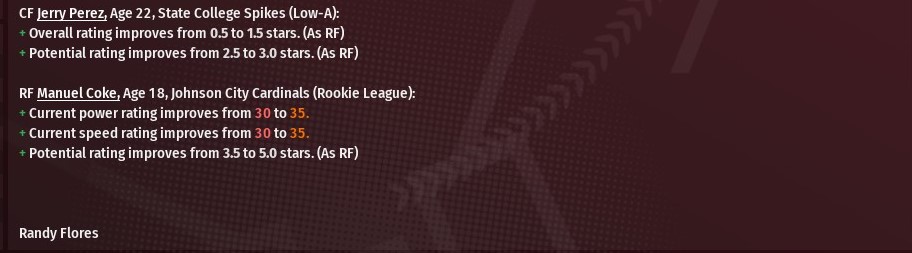 The trade isn't much of a surprise. While Rossi had a very good season-plus with St. Louis since being acquired from Kansas City, the Walkers lineup was very weighted to the left-handed hitting side. With All-Stars, Jose Ramirez in left field and Jose Segura in center, it made the most sense to try and find some balance by trading Rossi. Especially, after the Walkers were able to acquire right-handed hitting right fielder Alex Greene from Peoria in the off-season. In 2031, Rossi, 29, hit .288 with 32 homers and 94 RBIs in 151 games (145 starts) for the Walkers. In his full-season plus in St. Louis, Rossi hit .302 with 55 homers and 151 RBIs in 248 total games. Chang is a bit of an unknown quantity. He spent just one season with Cincinnati in 2031, getting into 156 games during which he batted .214 with 21 homers and 65 RBIs. For his career, in the majors, he has hit .219 with 25 homers and 75 RBIs. However, he is considered a well-above average defender at first base -- giving the Walkers an option to the left-handed hitting Rick Scott -- and also is considered a plus-defender in the corner outfield positions. The other player involved in the deal, Salinas, is a minor league signing who has yet to play above rookie league. |