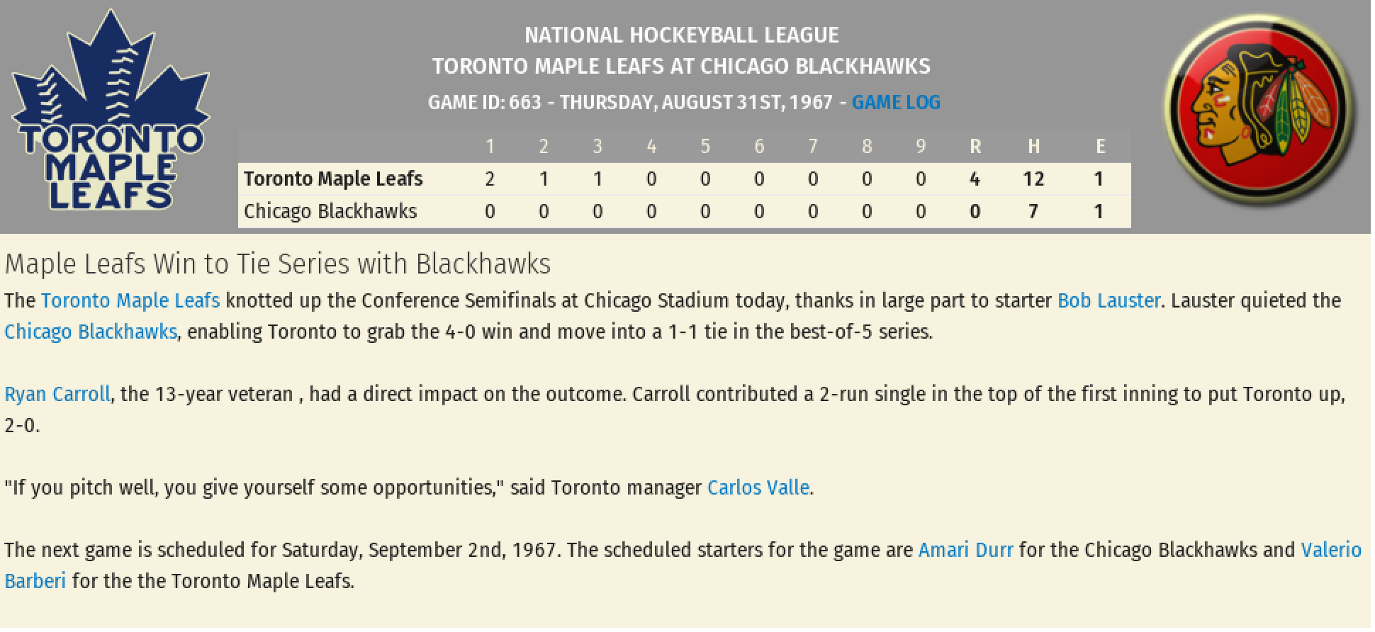The year is 1967. 12 National Hockey League franchises have started their own baseball league. Let's see which team wins the most Stanley Cups, baseball-style. Instead of three periods, there will be nine innings.