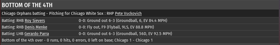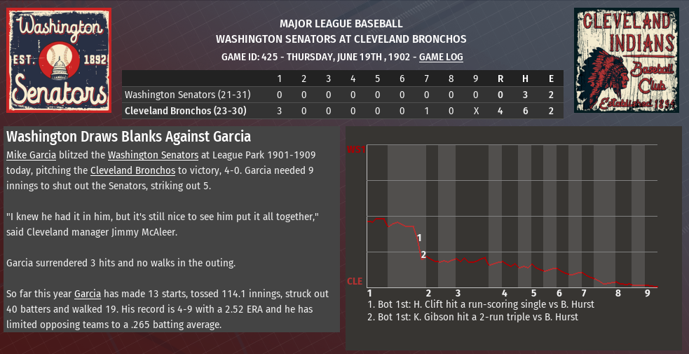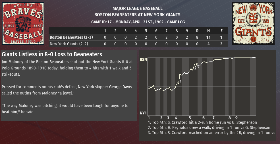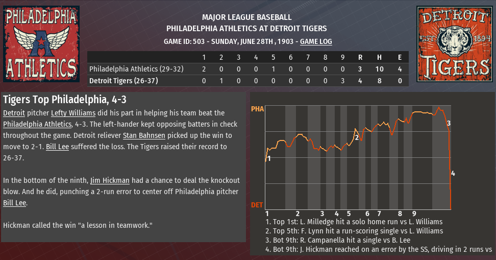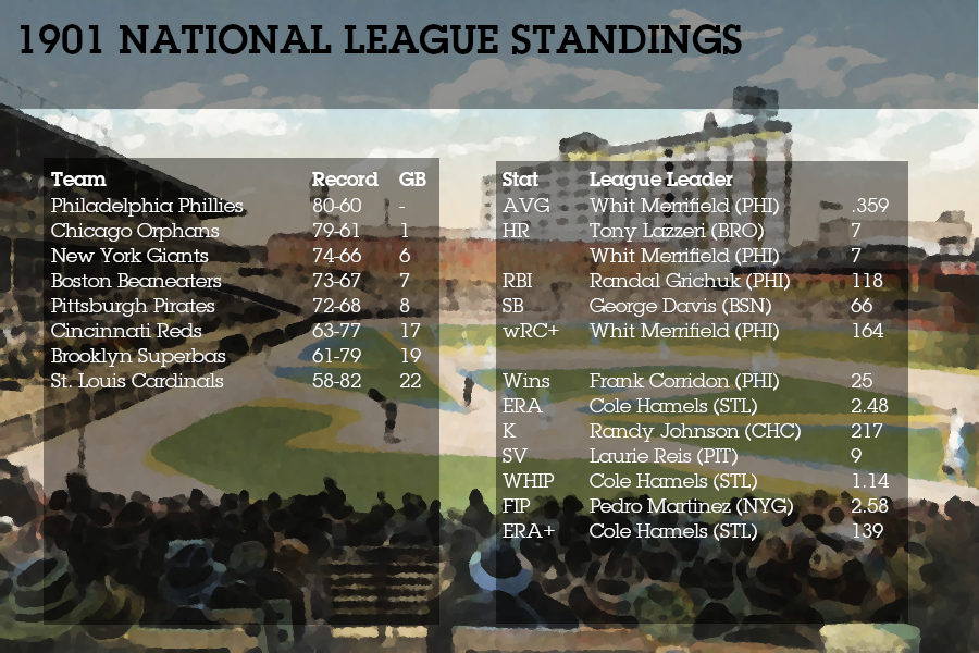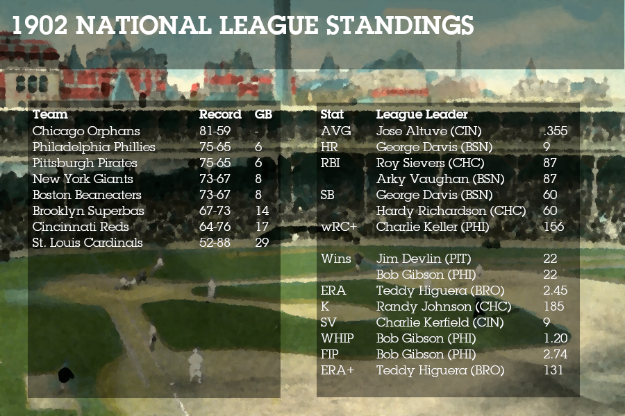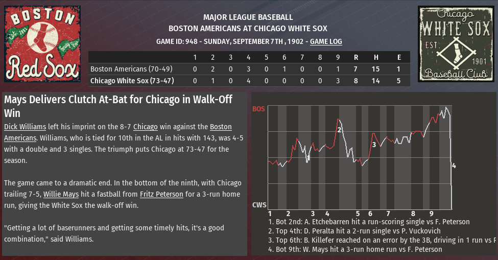 Two Way Sensation Jim Whitney Most players tend to specialise on either hitting or pitching but that's not enough for the grasshopper. When he's not called on to pitch, you can see Whitney pulling duty in Detroit's Right Field (where he provides pretty good defense). He went .282/.357/.375 for a 115 wRC+ with 42 stolen bases as a hitter and 18-11 with a 2.85 ERA as a pitcher. We shall watch the rest of this 28 year old's career with interest. A Wild Pitch Outshines Meusel's Two Home Runs Home Runs are rare in this age so when Bob Meusel hit two for the New York Giants against the Chicago Orphans it was certainly noteworthy. The Giants were down most of the game but Meusel's second tied it up 7-all in the bottom of the 8th to eventually force extra innings. The bottom of the 10th was a nightmare for Chicago Pitcher Will White, who gave up a 4-pitch walk and hit by pitch to start the inning. Meusel got on base via a fielders choice to advance a runner to third and then a wild pitch from White got the runner home to walk it off. A Pitcher's Duel for the Ages Cole Hamels and John Smiley combined for 450 pitches as the Cardinals and Reds battled it out for 17 innings until the Reds were finally able to call themselves the owner of a 2-1 victory. Hamels, picked up the loss after conceding two unearned runs. Though he only had himself to blame, a fielding error from himself in the 8th was what let the Reds tie it up in the first place. Speaking of Long Games The Boston Americans and Philadelphia Athletics played out a 19 inning marathon with Boston's Charles Bender going for 16.2 innings and 235 pitches before giving in. The Americans thought they were going to edge it in normal time, as they led 4-3 going into the 9th but some smallball antics from the Athletics got them the run they'd need to tie the game up. The Athletics certainly had chances throughout the game, they left 23 men on base compared to Boston's 11. They thought they had finally done in in the top of the 19th when Pitcher John Danks hit a double, and then a subsequent throwing error in the next at-bat let him score. The Americans opened up the bottom of the 19th with a double of their own before an error allowed that runner to score and tie the game back up. Luckily, David Peralta finished the game off with a sac fly to get the runner on third home. That's my MVP. Team Changes The Cleveland Blues change their name to to the Cleveland Bronchos for 1902 and the Milwaukee Brewers decide to shift their operations over to St. Louis and become the St. Louis Browns. Some Retirements Some notable names to retire (who haven't achieved a lot in this version of reality) are Roger Hornsby, Nomar Garciaparra, Fred McGriff, and Edwin Encarnacion. Philadelphia Trading The Phillies are keen for another crack at the title and acquire star pitcher Bob Gibson from the Philadelphia Athletics in exchange for three young guys.