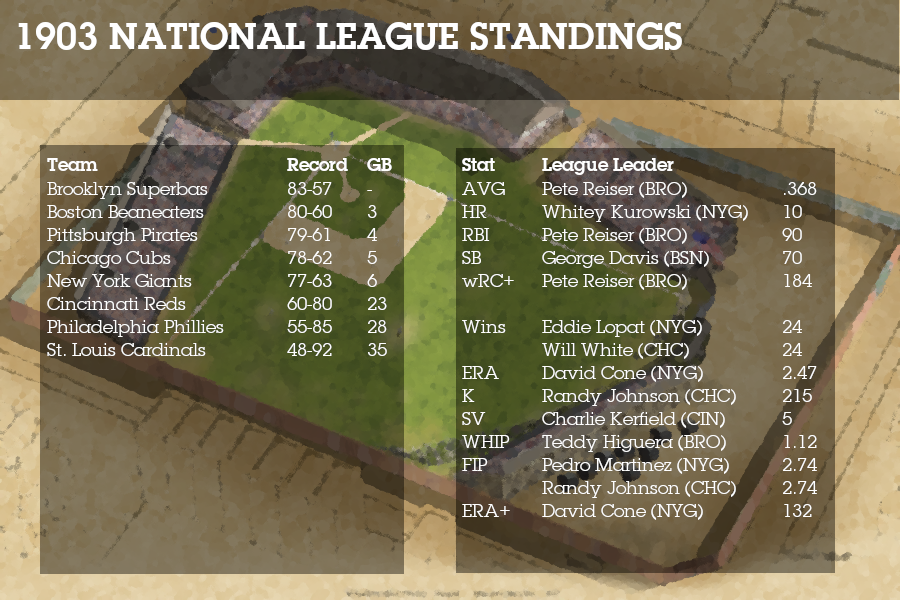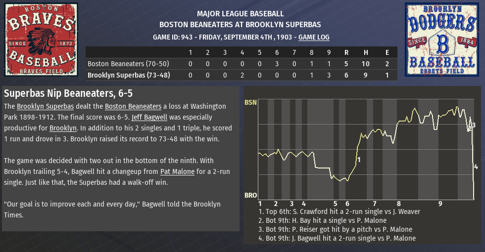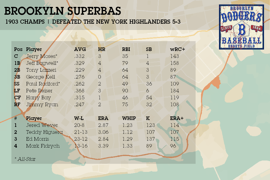 After 1902 saw the two Chicago teams fight it out for supremacy it was looking it was going to be the two Boston teams to fight it out in the World Series. The Boston Americans, led by two-time MVP LF David Peralta and Pitcher of the Year Charles Bender and the Boston Beaneaters with their own MVP SS Arky Vaughan and his gang of young talent like like CF George Davis and LF Sam Crawford both started the season strong and hold leads going into August. But it all starts to come crashing down on the 14th of August. The 57-42 Americans are taking on the 43-55 Philadelphia Athletics. Their starter for the game is Chuck Rose, making his first ever MLB start and with only 1.1 innings under his belt shut the Americans out for the first five innings. He'd eventually give up three runs but the Athletics would take the win 6-3 to give Rose his first win. Meanwhile, over in New York, the 55-41 Highlanders recorded a win over the Senators behind the pitching of Nick Altrock thus taking over the top spot in the AL standings by half a game. The St. Louis Browns were also right in the mix. And shifting focus to Philadelphia again, the 61-40 Beaneaters lost to the 37-64 Phillies in a tight 2-1 game that left them tied with the Chicago Cubs. The very next day, the Beaneaters would return home to play those very same Cubs. Inspired by the chance to take control of their destiny, the Cubs jumped out to a 6-1 lead. Boston will pick up some runs in the bottom of the 8th to eventually go down 6-4 but this day will mark the end of the dream of the All-Boston final. The Americans will crash and burn from this point forward. The Beaneaters fought on to take the top spot back but by the end of August, the National League was under control of the Brooklyn Superbas. Pistol Pete Reiser was a brand new player for the Superbas, the 20 year Left Fielder had provided a bolt of energy for the Brooklyn offense. By the end of August, he was slashing .377/.443/.557 for an OPS of exactly 1.000. Couple Reiser with First Baseman Jeff Bagwell and Brooklyn were engaging in a full out assault on pitchers with extra base hits. A 16-8 July and 18-9 August left everyone else in the dust. The last opportunity the Beaneaters had against the Superbas came on the 4th of September. Going into the bottom of the 9th, the Beaneaters had a 5-3 lead. The Superbas got a run in early in the inning and proceeded to load the bases with 1B Jeff Bagwell stepping into the batter's box with two outs on the board. He took the first pitch for a strike, fouled the next one off, took for a ball, fouled another, took for another ball, and then fouled off the the next three before finally blooping a fly ball to land safely in left field for the walk-off. ![]() Ultimately this game wouldn't matter but the Beaneaters would spend the rest of the month in the shadow of the Superbas. Jumping back to the American League, the St. Louis Browns held a half game lead over the New York Highlanders at the end of August but the entire American League would be left with no answer to an incredible month of baseball from the Highlanders team. The Highlanders would go 19-7 over September, which include series sweeps over their main competition in the Browns and White Sox (the Boston Americans went 9-15 to disappear from view). A year removed from the All Chicago World Series, we now had an all New York World Series between the New York Highlanders and Brooklyn Superbas. ![]()