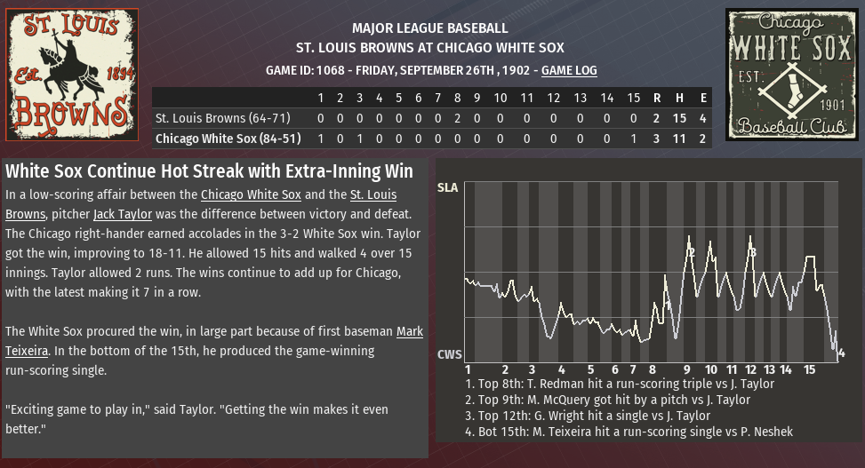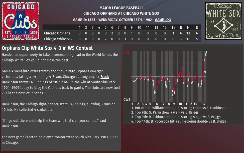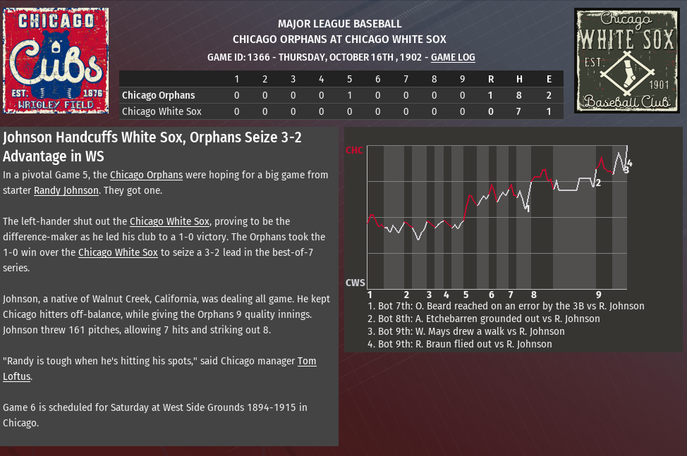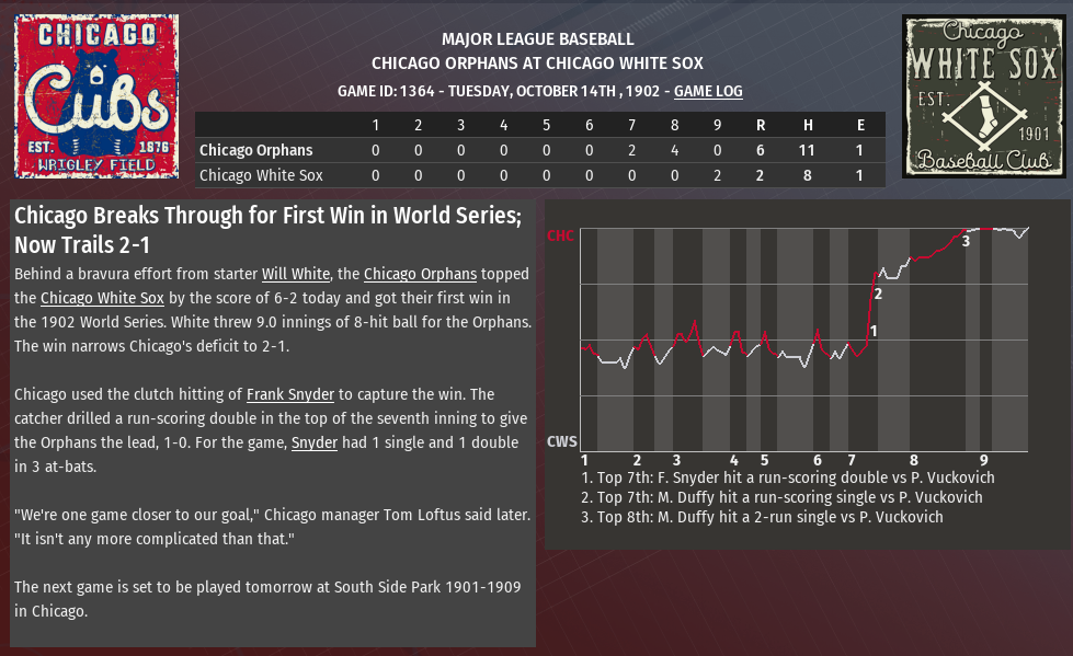 ![]() The favourite Chicago White Sox put on a show in the opening game of the World Series as they absolutely shell Orphan Pitcher Frank Harkinson forcing him out after 3 innings with an 8-0 deficit to his name. The Orphans showed some life later in the game but it meant little as the White Sox draw first blood. ![]() Chicago Tops Chicago Again. Good Headline. The Orphans came out firing with a 4-run second inning thanks to a RF Gerardo Parra Triple and 3B Matt Duffy Home Run but once the game switched over to the 5th, the White Sox hitters starting to figure out Randy Johnson who finally gets pulled during the 6th with his side down 7-4. The runs kept flowing but the White Sox pulled away for a 2-0 lead in the series. ![]() It was a pitcher's duel to begin the game as neither Will White (Orphans) or Pete Vuckovich (White Sox) give up a run over the first 6 innings. It's the bottom of the order that initially come through for the Orphans as 1B Dave Foutz hit a single, stole a base, and then was driven in by C Frank Synder double. A single from 3B Matt Duffy is enough to then get Synder home for a 2-0 lead after 7 innings. The Orphans then pile on in the 8th for a 6-0 advantage. The White Sox fight back in the bottom of the 9th but it's not enough as the Orphans pick up their first win of the series. The White Sox are still in the driving seat with a 2-1 lead in the series. ![]() After getting shelled in game one, Frank Hankinson was determined to redeem himself and went for every inning in this 14 inning marathon. His counterpart, Buttons Briggs did the same as the pair combined for 415 pitches. Both teams let chances slip by, the White Sox finished 4 innings with runners in scoring position while the Orphans finished 8. The White Sox running game was certainly not on point, their 5 stolen base attempts all ended in failure while the 7 attempts by the Orphans all were all successful. RF Gerardo Parra turned out to be the key run -- not once but twice -- for the Orphans. He lead off the top of the 9th, with the Orphans down 3-2 with a walk. A C Frank Synder bunt gets him to second, and finally a CF Richie Ashburn line drive to left field is enough for him to drive Parra home to tie it all up and force the extras. Parra featured again in the top of the 14th when he hit a single with two outs on the board. New Catcher Biff Pocoroba then hits a double out to right field to get Parra home for the lead. Aside from a Andy Etchebarren single, the White Sox have no answer in the bottom of the 14th. Frank Hankinson gets the last out of the game via three strikes without a swing from pinch hitter Ron LeFlore. That ties the series up at 2-all. ![]() If you thought Game Four was low scoring, then this game was nothing but the two left handers Randy Johnson and Duster Mails pitching shutout ball. Johnson is the one who comes out the victor thanks to a SS Denis Menke run in the 5th driven in by a 3B Matt Duffy sac fly. After being down 2-0, the Orphans now hold advantage in the series. 3-2. ![]() And the third game in a row that is decided by a single run. Pete Vukovich and Will White battle it out but it's the bat of Chicago Orphan 3B Matt Duffy that proves the difference as he drives in 1B Dave Foutz in the bottom of the 5th. That's the 7th RBI for Duffy over the series as he is awarded MVP. One nice quirk for Vukovich was his 4th inning which he completed in just 3 pitches. ![]() But anyway, The Chicago Orphans are the 1902 World Champions.
