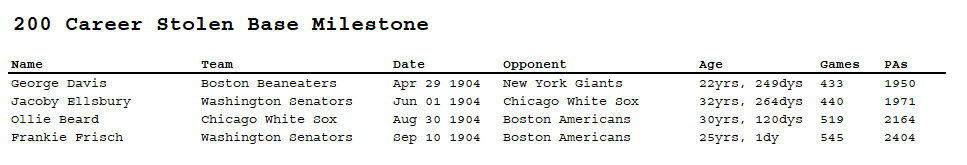 ![]() Boston Beaneater CF George Davis is the first to 200 stolen bases for his career on the 29th of April, 1904 in a game against the New York Giants (that they lost 12-7). He'll be nearly immediately thrown out trying to get home from second on a fly out. It took Davis 433 games and 1950 plate appearances to achieve the mark. CF Jacoby Ellsbury (Washington Senators), SS Ollie Beard (Chicago White Sox), and 2B Frankie Frisch (Washington Senators) also reached the mark this season. So far, Davis is the youngest of the bunch to reach this mark and required the least amount of games or PAs to do it. ![]() ![]() His 250th career stolen base also happened this season after he drew a lead-off walk in the 1st. Unlike the 200th, this one actually came in a win as the Beaneaters defeated the Cardinals 4-2. ![]() MVP Rod Carew showed his mettle in this game against the New York Highlanders, with his side down 6-3 after the Highlanders unleashed a 5 run inning in the 6th. Carew, hit a double and then a couple at-bats later took advantage of a fielding error from the New York Center Fielder to get himself home. But the job wasn't done, in the top of the 9th he hit a two-out two-RBI double to give his side the lead. ![]() Speaking of two-out heroics. How about this two run single from LF Paul Molitor to secure the walk-off victory. ![]() Or (again with two outs), this bases clearing double from SS Ernie Banks to get the win for the Americans. Rookie Draft Pick 1: Washington Senators pick 18 year old RF Silent Mike Tiernan. Pick 2: New York Giants pick 22 year old SP Little Bill Sowders. Pick 3: Detroit Tigers pick 21 year old 1B Don Hurst. Pick 4: New York Highlanders pick 20 year old 3B Brooky Jacoby. Pick 5: St. Louis Cardinals pick 22 year old 1B Elbie Fletcher. Pick 6: Cincinnati Reds pick 21 year old SP Andy Pettitte. Pick 7: Philadelphia Phillies pick 20 year old RF Paul 'Molly" Meloan. Pick 8: Boston Americans pick 26 year old RF Smead "Guinea" Jolley. Pick 9: Chicago Cubs pick 21 year old SP Adam Eaton. Pick 10: Cleveland Naps pick 21 year old SS Wally Gerber.