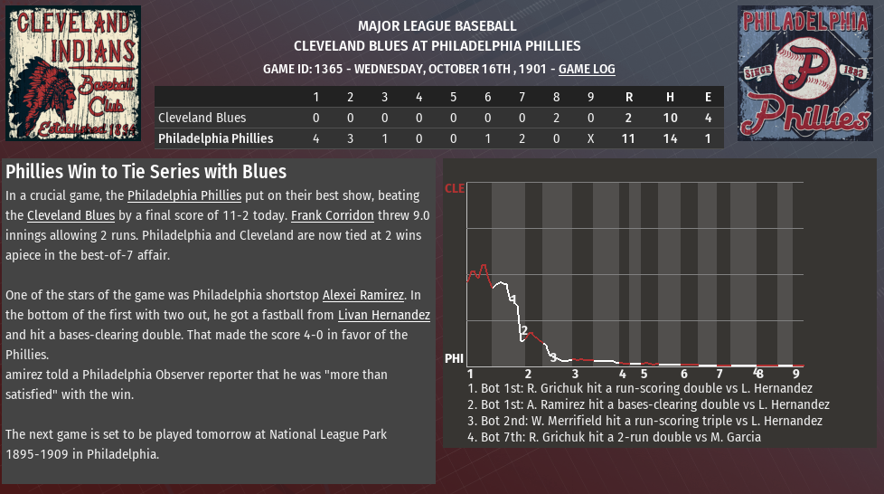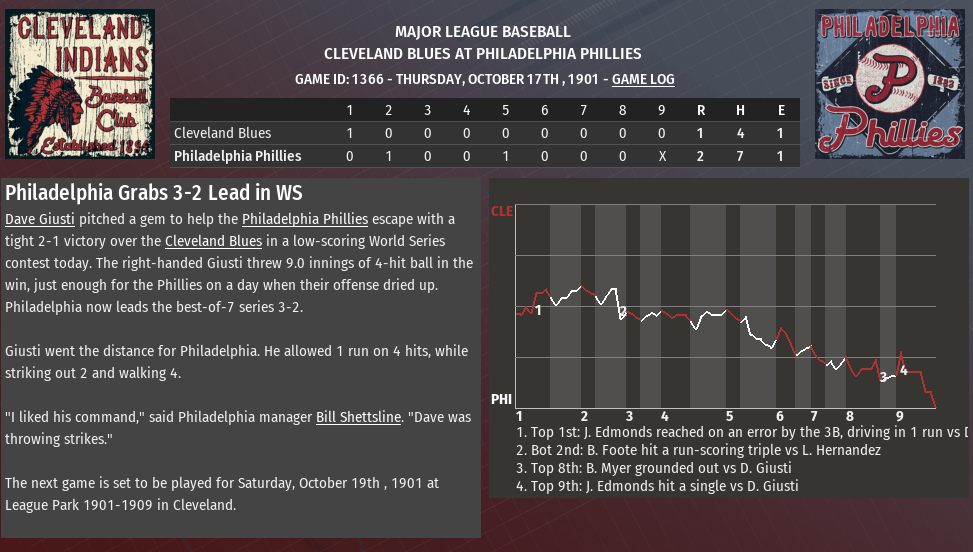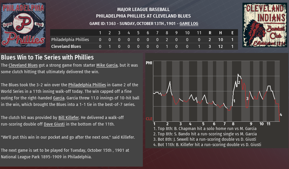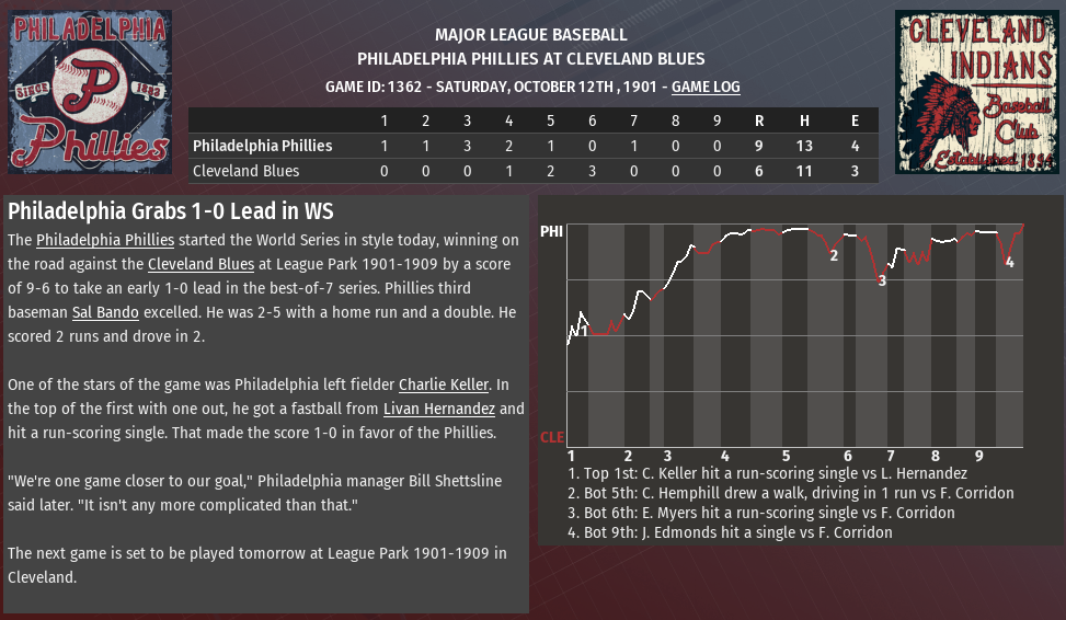 Game One: In a bizarre decision, the Cleveland Blues hand the ball to Livan Hernandez to be their pitcher for game one rather than their regular ace, Mike Garcia. Hernandez was still easing back into pitching after fracturing his hand back in May. Up til this injury, Hernandez had might lights-out but his three starts since returning had been underwhelming. The Phillies took full advantage as they ran out to a 7-0 lead before Hernandez was finally pulled off the mound in the 4th. But not before the opposing pitcher hit a triple off him. The Blues did mount a bit of a comeback but the Phillies kept them at bay to take the first game 9-6. ![]() Game Two: The Blues strike back in Game Two as both pitchers keep the run scoring low. Mike Garcia, in particular able to keep the Phillies off the board until RF Ben Chapman sent him deep with a lead-off home run in the top of the 8th. The Phillies will pull ahead only for the Blues to strike back immediately in the bottom of the 8th to eventually push the game to extras. It's in the bottom of the 11th that the Blues walk it off via a double from Catcher Bill Killefer that lets the notoriously slow First Baseman Erubiel Durazo score from 1st. ![]() Game Three: Cleveland Pitcher John Smiley gave up two runs in the 1st but shut it down from that point on. He had to wait until the 8th to see his team take the lead thanks to a throwing error from Phillies Catcher Bill Killefer which set up Cleveland LF Kirk Gibson to blast a two run single to drive two runners in for the win. ![]() Game Four: Cleveland tried throwing out Livian Hernandez out there again and this time the results were even worse than game one as he departed the game after the first inning with a 7-0 deficit to his name. The Phillies will tie the series up with a 11-2 win in the end. ![]() Game Five: Third time is the charm for the Livian Hernandez experiment. Since he only pitched 27 pitches in game four (giving up 7 runs in the process), Cleveland decide to put him back on the mound in game five. He finally gets it together and goes the distance. Unfortunately for him, the opposing pitcher Dave Giusti has also come to play as they collectively keep the run count down. It's Whit Merrifield that ultimately grabs the winning run. He gets a triple in the bottom of the 5th and a Randal Grichuk single proves enough to get him home. Grichuk would provide one more bit of magic at the end, when he throws out the speedy Darby O'Brien at third to end the game and put the Phillies within one game of winning the first World Series. Livian Hernandez pitched well in this game but ended with a 0-3 record and 10.95 ERA in this series. ![]() Game Six: The Phillies clinch it but it's a rollercoaster of a game to do it. The lead change hands several times over the game. It was looking dire in the top of the 8th with two outs and the Phillies down two runs but they rallied and loaded the bases until finally a Charlie Keller Single got 2 runs home to tie it up, Whit Merrifield narrowly beating the throw from home to score from 2nd base. The Blues struck back in the bottom of the 8th but a throwing error from Cleveland CF Jim Edmonds let the Phillies tie it back up again in the top of the 9th. Cleveland had no answer in the bottom of the 9th as the game shifted to extras. Edmonds would be in the spotlight in the top of the 10th. The Phillies were down two outs pretty quickly but Phillies CF Randal Grichuk blasted a line drive straight to Edmonds, who promptly fumbled it and let Grichuk reach first. Sal Bando got a double in the next at-bat which was enough to get Grichuk home for the lead. Phillies pitcher Scott Oberg only needed 5 pitches to extinguish Cleveland hopes in the bottom of the 10th, the final action of the season being a 3-6-3 double play. ![]() And with that, the Phillies become the first ever World Series Champions. They dwindled around the .500 mark for the first three months of the season but a Whit Merrifield hit streak proved a catalyst for the team to make it's move for the top spot in the National League. Merrifield was certainly the team MVP but the contributions of the outfield trio of LF Charlie Keller, CF Randal Grichuk, and RF Ben Chapman also proved key.