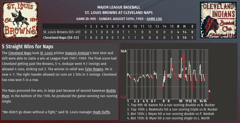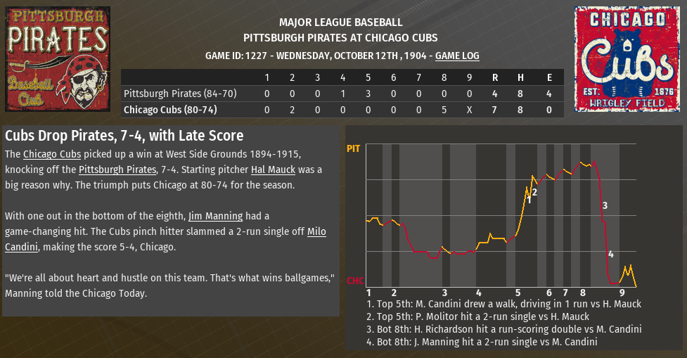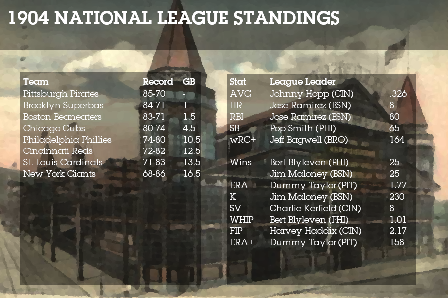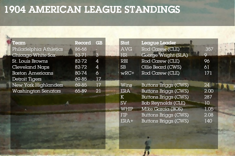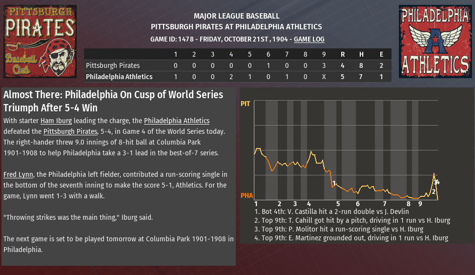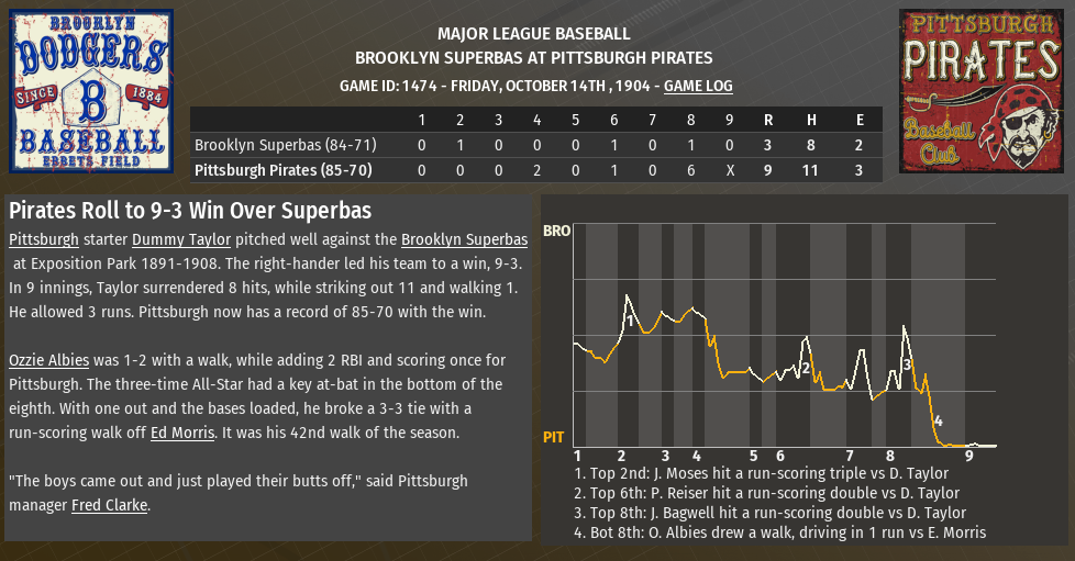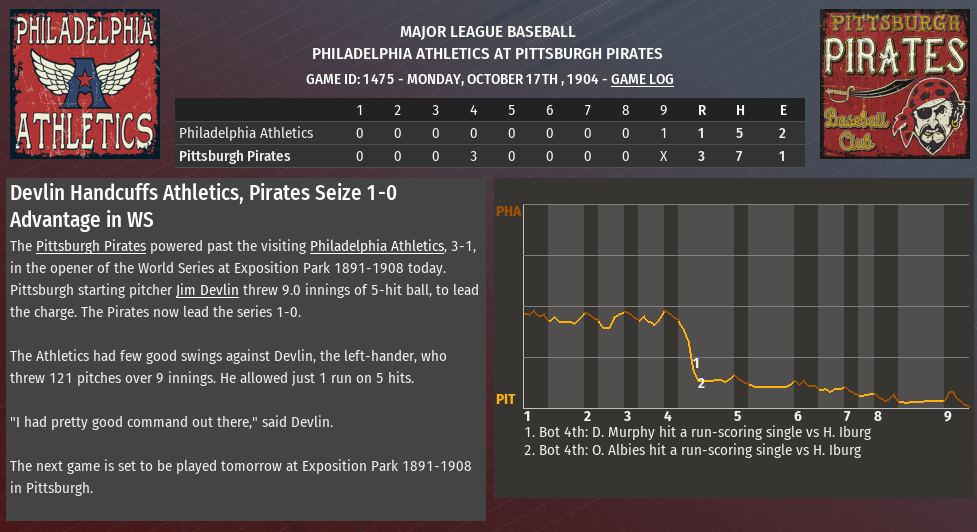 Over ballparks all over the MLB, conversations like this was happening with owners. "Hey boss, should we get some new balls? These ones look a bit scuffed up and dirty." The boss looked at what he was being shown. He initially thought he had been shown a box of rats rather than a box of baseballs but he considered the cost of new baseballs. And then thought of the various rooms he wanted to add to his house. "No" League Batting Average and ERA came tumbling down in 1904. In the American League, league wide batting average went from .273 to .252 and ERA from 3.32 to 2.81. You see similar results in the National League as batting average goes from .266 to .251 and ERA from 3.21 to 2.77. Two pitchers in each league rose to produce numbers never seen before. White Sox Pitcher Buttons Briggs took his game to a whole new level and over in the National League, 18 year old wonder kid Bert Blyleven took the baseball world by storm at the front of the rotation for the Phillies who dismantled lineups with his curveball. (unfortunately for a Phillies team that never looked like competing) The St. Louis Browns ran out to a strong start in the American League thanks to strong hitting from SS George Wright and 1B Miguel Cabrera. An 8 game win streak going into the All Star break saw them hold a 4.5 game lead over the Philadelphia Athletics but they'd soon fall from their perch. Straight from the All-Star game, they lost a 3 game series against the Athletics 2-1 and then got swept in a 4 game series by the Boston Americans. By the end of August, it's turned into a six-way race for the pennant. The Chicago White Sox have the lead, spurred on by the efforts of Buttons Briggs, closely followed by the Browns, Athletics, Americans, Highlanders, and Naps. The Pittsburgh Pirates hold a big lead in the National League at the end of July with the Cubs, Superbas, and Beaneaters nipping at their heels.By the end of August, that lead has disappeared as all three teams start to gain ground on them. Setting it up for a tense finish as we move to the business end of the season. As we skip ahead to the 5th of October. The Philadelphia Athletics hold a 2.5 game lead over the White Sox, Naps, and Browns. The Athletics hold their nerve, win a series against the Naps 2-1 and then deal with the basement dwelling Washington Senators 3-1 in a 4 game series. Not leaving any chance for anyone to catch them as they pick up their first ever AL pennant. On that same day -- the 5th of October -- the Pirates hold a 1.5 game lead over the Superbas in the National League. The Pirates drop two out of three against the Phillies while the Superbas do the same against the Reds to keep that 1.5 game lead intact. The Superbas have two games left in the season against the Giants while the Pirates have a three game series against the Cubs. The Superbas win their final two games to finish off with a record of 84-70 while the Pirates split their first two games against the Cubs to take their record to 84-69. The Pirates are in danger of being forced into a tiebreaker game with the Superbas if they don't get their act together. ![]() They don't get their act together. It all comes apart in the 8th as the Cubs pile on 5 runs to win the game. The Pirates and Superbas will now play a tiebreaker to see who'll represent the National League in the World Series against the Philadelphia Athletics. ![]() The 8th inning is once again the inning that decides things but in this case, its in the favour of the Pirates. Going into the bottom of the 8th with the game tied up 3-all, the Pirates unleash with 6 runs to secure their first ever spot in the big dance. ![]()